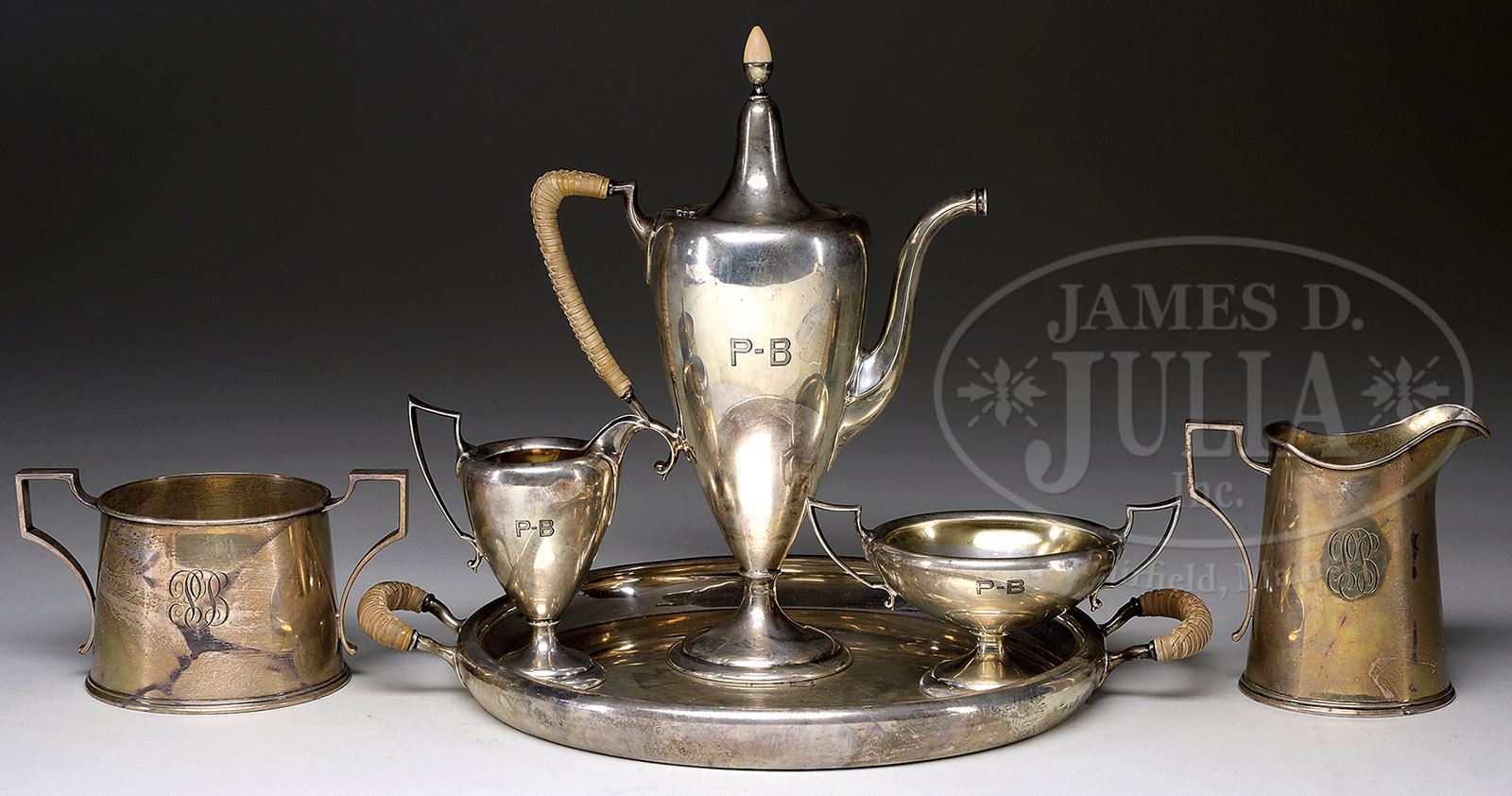 LOT OF GORHAM STERLING SILVER. Lot consists of: 1) A Gorham sterling silver tea set with teapot, cream and sugar, and tray. Each piece has monogram “P-B” and is signed on the underside with Gorham hallmarks, style #, and “Sterling” as well as “Smith Patterson Co.” The handles on the tray and teapot have a woven reed covering. Total weight of tea set is 27.9 troy ounces. 2) Gorham sterling silver cream and sugar monogrammed with initials “PB”, signed on the underside with Gorham hallmarks, “Sterling”, and “GZL”. Also marked Shreve, Crump, & Low Co. Total weight is 10.3 troy ounces. SIZE: 1) Teapot is 9″ t. 2) Creamer is 3-3/4″ t. CONDITION: All are very good to excellent. 7-70568 (800-1,200)