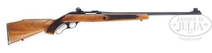 *SCARCE SAKO FINNWOLF LEVER ACTION RIFLE PRESENTED TO THE LATE ACTOR LEE MARVIN. SN 13545. Cal. 308. Beautiful modern lever action rifle with 23″ tapered rnd bbl, ramp front sight with hood, no provision for a rear sight and the receiver mounted with special Sako bases, the rear of which also acts as a base for a detachable peep sight. Top of the left side of the receiver is marked “COMMEMORATING THE FOUNDING OF THE SAKO COLLECTORS ASSN 1982 81 OF 175”. Mounted in nicely figured, checkered walnut with Monte Carlo & cheekpiece buttstock with Sako black composition buttplate. Buttstock & forestock have sling swivel studs. Accompanied by an orig instruction pamphlet, a parts list and two orig Sako peep sights with adjustable apertures from 100-200 yards that are also windage & elevation adjustable. This rifle was presented to Mr. Marvin by Sako while in Finland working on the 1984 movie Gorky Park. Accompanied by affidavit from Mrs. Lee Marvin stating that this pistol was Lee Marvins. PROVENANCE: The late actor Lee Marvin. CONDITION: Extraordinarily fine. Remains new & unfired with all of its orig factory finish. 4-38930 JR116 (2,500-4,000)