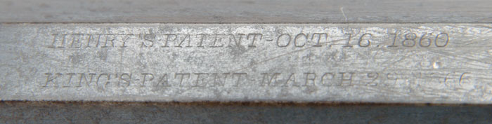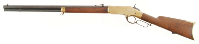 WINCHESTER MODEL 1866 LEVER ACTION RIFLE. Cal. 44RFHenry. SN 20807. Standard rifle with 24-3/8” oct bbl, standard front sight & 900-yd Henry style ladder rear sight. The top flat has Henry & Kings patent markings. Is mounted with straight grain American walnut with straight stock & crescent brass buttplate with trap containing an orig 4-pc brass & iron cleaning rod. The last 3 digits of the serial number are stamped in the top tang channel of the buttstock & inside the toe of the buttplate. The hammer spring is a modern replacement as is the trigger return spring. Broken pieces of the originals accompany. Buttstock & forend cap have factory sling swivels. CONDITION: Very fine. Bbl & magazine tube retain 75-80% strong orig blue with scattered light surface rust. Receiver has sharp edges with a smooth medium yellow patina. Some of the screws retain orig blue. Lever has traces of orig case colors with the balance a medium to dark patina. Stock has a grain check on each side by the toe, otherwise the wood is sound with a light restored finish. Mechanics are crisp, strong bore with good shine with moderate pitting. 4-56572 JR442 (15,000-25,000)