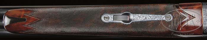 *EXCEPTIONALLY FINE AND RARE DELUXE NO. 6 SPECIAL ENGRAVED, ROUNDED FRAME WINCHESTER MODEL 21. SN 16606. Cal. 12 ga. 3″ Chambers. 30″ Barrels with raised, concave, matted rib, are engraved “CUSTOM BUILT BY WINCHESTER” in milled out portion of rib. Breech ends of bbls have 3″ triangles of fine shaded scrollwork. There are also 1-1/8″ triangles of scroll at muzzles as specially ordered and referred to on factory build sheet. Bbl flats are stamped with SN, gauge, and “3 in. cham.” (3″ chambers were specially ordered). Bottoms of bbls are stamped “Mod” and “Full”. Special order rounded blued action is fitted with automatic safety and single selective trigger. Action body is wonderfully engraved with full coverage shaded medium scrollwork, the only exception being a classic semi-relief vignette of four ducks in marsh on floorplate. Factory records indicate this specification and stating that the bottom of frame “is to have design exactly same as on gun 10678.” It is most certain that this gun’s fine engraving is the work of noted Winchester artist George Ulrich. Extremely fine XXXX crotch figured American walnut straight grip buttstock measures 14-1/4″ over checkered wood butt, with standard point pattern checkering and gold oval on toe line engraved as specified on worksheet, “W. B. 1941”. The worksheet also states that the length of stock to be 14-3/4″ and fitted with Winchester recoil pad “to be leather covered and well rounded.” Long splinter forend has bolsters carved at rear of checkering with ebony forend tip. SN is on iron. Change order dated 1/21/41, refers to this gun with “reg. forearm to be shaped same as gun # 10678” with hand written notation, “taken care of by H. Orre.” It is likely that the checkered butt observed on this gun was also changed on this order as it is properly numbered to the gun in the tang channel. Bore diameter: left-.729, right -.729. Bore restrictions: left .009, right -.030. Wall thickness: left -.026, right -.034. Drop at heel: 2-3/8″, drop at comb: 1-1/2″. Weight: 7 lbs. 8 oz. LOP: 14-1/4″. PROVENANCE: Cody Firearms Museum letter with specifications, measurements and copies of build cards, as built for Cook, Newton, & Smith, sold to Mr. William Brewster Jan 18, 1941, with Brewster family history. William Brewster was the son of Frederick Foster Brewster, financier and builder of “Edgerton”, his private mansion in New Haven, CT. Also included are copies of National Cyclopedia of American Biography outlining the life of William Brewster, trust officer of 2nd Natl Bank of New Haven, and his later life and community service with various clubs and societies including Mystic Seaport. CONDITION: Excellent. Bbls retain nearly all of what appears to be orig blue with a very few barely mentionable minor marks. Action retains essentially all of its blue, with just a hint of silvering on tips of fences. Stocks retain nearly all of their orig varnish finish, with some wear at heel and on butt, with just a hint at the tip of comb. There are some very minor marks in varnish. Forend retains most of its varnish, with 4 or 5 small chips in finish along bbl channel on left side. Bores are excellent, bright and shiny with no visible imperfections. Action is tight. Bbls are on face. Ejectors are in time. Trigger works. An exceedingly rare special order pre-war custom. 4-45056 MGM208 (35,000-55,000)