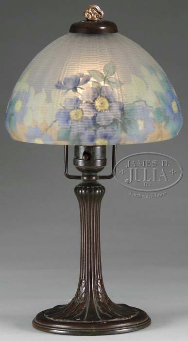 HANDEL BOUDOIR LAMP. Lamp begins with a domical shade in a molded basket weave design. Reverse painted with a blue wild rose and foliage decoration having variegated green foliage all on a frosted ground. This is a very rare color combination for this lamp. Supporting the shade is a nicely patinated base of complimentary art nouveau. Base is complete with a top cap and ornate finial. Shade is signed “Handel 6353” and artist initialed “K.C.”. SIZE: Shade is 7″ dia. Lamp is 13-1/2″ t. CONDITION: Very good to excellent. 5-62501 (1,500-2,000)