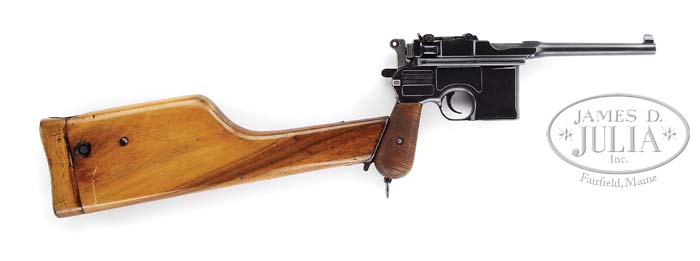 *MAUSER MODEL 1896 SMALL RING SEMI-AUTO BROOMHANDLE PISTOL. SN 214326. Cal. 30 Mauser. Blue finish with 5-1/2″ tapered rnd bbl that has integral barleycorn front sight and 1,000 meter adjustable rear sight. Mounted with matching numbered walnut grip panels with re-cut grooves and has a lanyard ring in the butt. Accompanied by its orig matching numbered walnut stock holster. Stock holster has a repaired longitudinal grain crack on back side. Numbers on the stock iron are different size & font from the pistol and may have been added. CONDITION: Very good to fine. Retains virtually all of a fine professionally restored finish with some light dings & scratches over the SN below the takedown latch. Mechanics are fine, strong bore, frosty in the grooves. Stock with its repaired crack retains most of a professionally restored finish. 4-39268 JR298 (1,000-2,000)