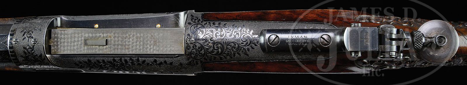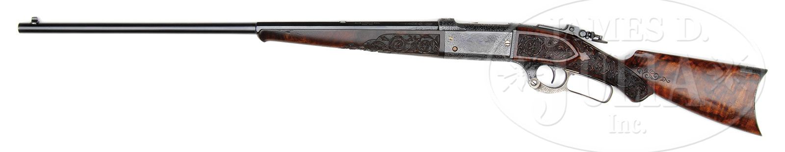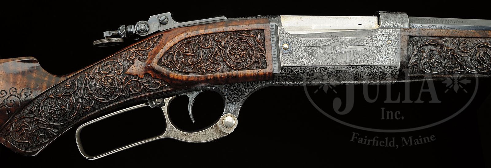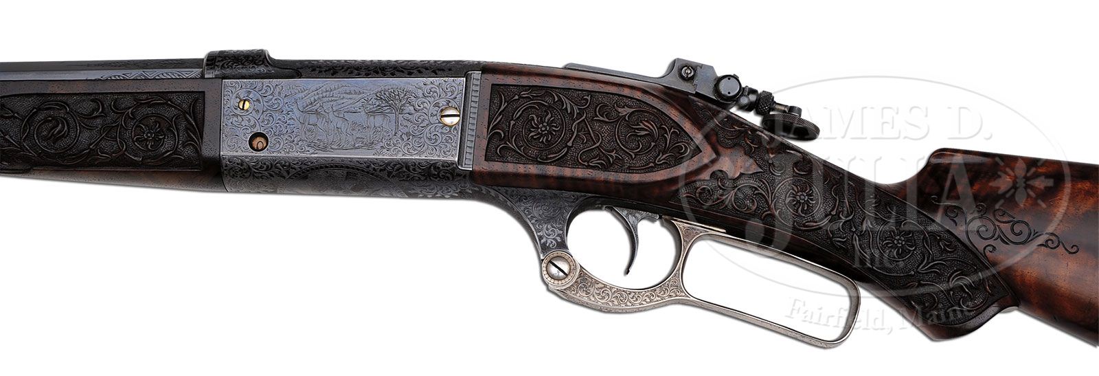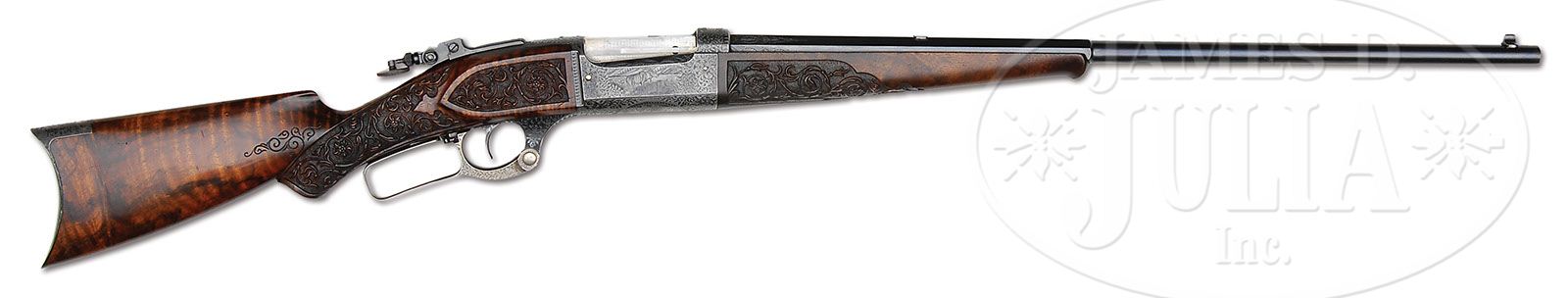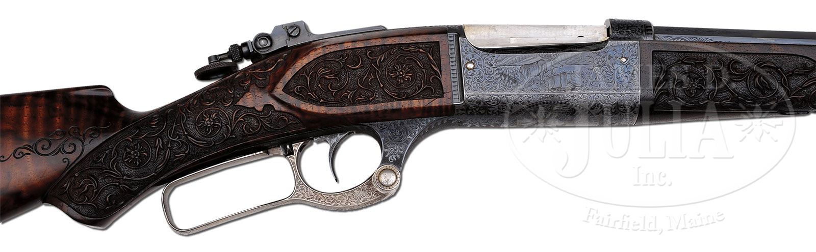 *RARE SAVAGE MODEL 1899 RIVAL/MONARCH GRADE DELUXE ENGRAVED LEVER ACTION RIFLE. SN 46434. Cal. 303 Savage. Spectacular rifle with 26″ oct to rnd bbl, Lyman ivory bead front sight, slot blank in rear seat and a Lyman, windage adjustable, locking tang sight. Mounted with beautiful, highly figured circassian walnut with schnable tip forearm and serpentine pistol grip stock that has crescent steel buttplate. The forearm, raised side panels and grip area of the stock are wonderfully deep relief carved in flower & vine patterns with fine stippled background. Carving patterns extend down each side of buttstock. Receiver is wonderfully engraved, by Enoch Tue, with “F” style vignettes of a large whitetail buck and three does in a field scene with a tree and mountains in the background and the right side has the large vignette of a bull moose standing behind a reclining cow moose in a marsh scene with mountains in background. Bottom of receiver is engraved with the large oval vignette of a grizzly bear in a mountain scene, all surrounded by very fine foliate arabesque patterns with very fine stippled background. Engraving extends over top of receiver and lever boss with sides and outer face of lever, along with the buttplate tang- engraved to match. Exposed flats of bbl are engraved about 2-1/2″ over chamber area, with the caliber marking hand engraved. Screws are all gold washed. Top of receiver has been drilled & tapped for a scope base with the holes containing plug screws. Bolt is jeweled on top & right sides. Face of buttplate is black enamel painted. SN was observed on bottom of receiver, rear face of forearm, rear face of buttstock under buttplate and inside the buttplate. Accompanied by a Savage historian letter which identifies this rifle in caliber 303 Savage with half oct bbl, accepted from the Savage factory to the warehouse on Feb. 18, 1907 and shipped same day to Burhaus & Black, no address indicated. The listing also notes that this rifle was factory engraved in grade “F”, “The highest grade available at the time”. It also had pistol grip stock with special carving & gold washed screws. The letter also states that the engraving of this era, 1901 until about 1926, was done at the factory by Mr. Enoch Tue. While this rifle is listed in the records with “F” grade engraving it has Monarch grade carved wood and Rival grade engraving as depicted in the circa 1905 catalog. PROVENANCE: Mark S. Graham Collection; Wes Adams Estate Collection. CONDITION: Extremely fine. Bbl & receiver retain about 98% glossy orig factory blue with only faint sharp edge wear and some slight thinning on bottom at carry point; bolt shows light wear on jeweling; lever retains faded case colors on sides, turned silver on outer faces; buttplate tang retains strong case colors which may also be present under the black paint on the face; wood is sound with a few light nicks & scratches and retains most of a very professional, partially restored finish only on the smooth parts of the wood. Mechanics are fine, bright shiny bore. 4-44813 JR386 (40,000-60,000)