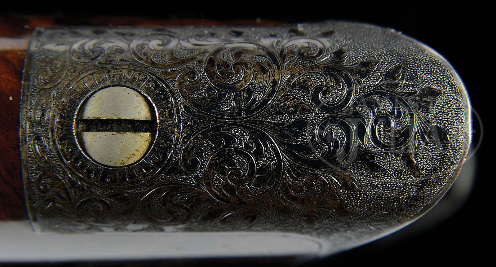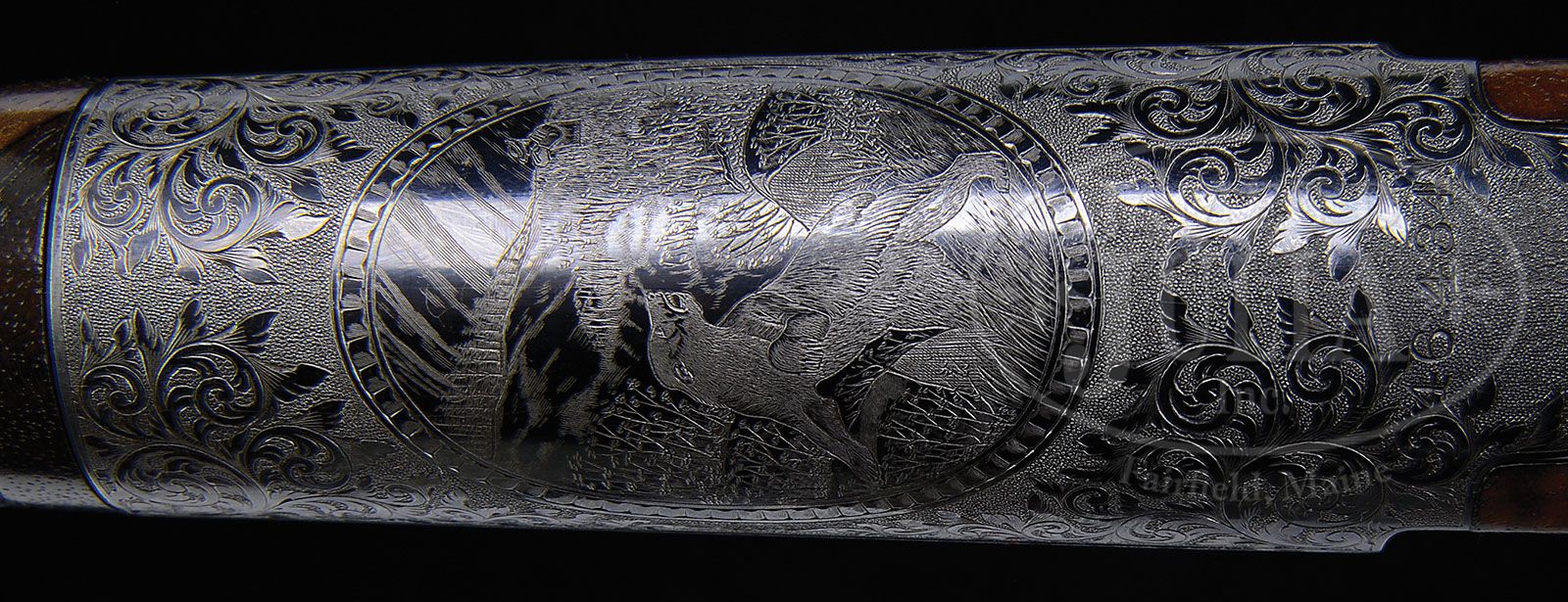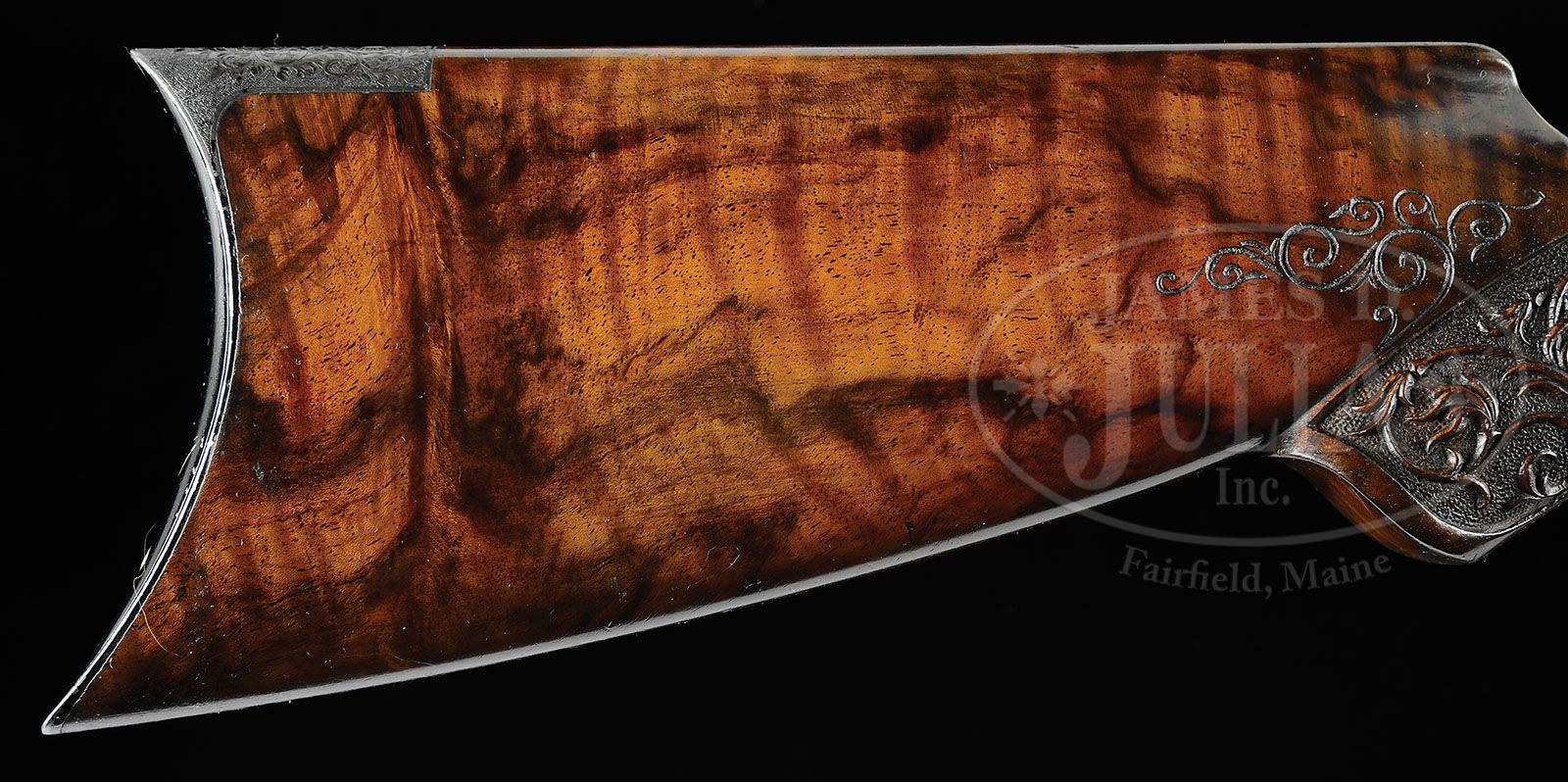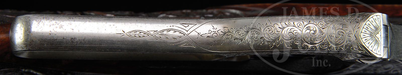 *RARE SAVAGE MODEL 1899 RIVAL/MONARCH GRADE DELUXE ENGRAVED LEVER ACTION RIFLE. SN 46434. Cal. 303 Savage. Spectacular rifle with 26″ oct to rnd bbl, Lyman ivory bead front sight, slot blank in rear seat and a Lyman, windage adjustable, locking tang sight. Mounted with beautiful, highly figured circassian walnut with schnable tip forearm and serpentine pistol grip stock that has crescent steel buttplate. The forearm, raised side panels and grip area of the stock are wonderfully deep relief carved in flower & vine patterns with fine stippled background. Carving patterns extend down each side of buttstock. Receiver is wonderfully engraved, by Enoch Tue, with “F” style vignettes of a large whitetail buck and three does in a field scene with a tree and mountains in the background and the right side has the large vignette of a bull moose standing behind a reclining cow moose in a marsh scene with mountains in background. Bottom of receiver is engraved with the large oval vignette of a grizzly bear in a mountain scene, all surrounded by very fine foliate arabesque patterns with very fine stippled background. Engraving extends over top of receiver and lever boss with sides and outer face of lever, along with the buttplate tang- engraved to match. Exposed flats of bbl are engraved about 2-1/2″ over chamber area, with the caliber marking hand engraved. Screws are all gold washed. Top of receiver has been drilled & tapped for a scope base with the holes containing plug screws. Bolt is jeweled on top & right sides. Face of buttplate is black enamel painted. SN was observed on bottom of receiver, rear face of forearm, rear face of buttstock under buttplate and inside the buttplate. Accompanied by a Savage historian letter which identifies this rifle in caliber 303 Savage with half oct bbl, accepted from the Savage factory to the warehouse on Feb. 18, 1907 and shipped same day to Burhaus & Black, no address indicated. The listing also notes that this rifle was factory engraved in grade “F”, “The highest grade available at the time”. It also had pistol grip stock with special carving & gold washed screws. The letter also states that the engraving of this era, 1901 until about 1926, was done at the factory by Mr. Enoch Tue. While this rifle is listed in the records with “F” grade engraving it has Monarch grade carved wood and Rival grade engraving as depicted in the circa 1905 catalog. PROVENANCE: Mark S. Graham Collection; Wes Adams Estate Collection. CONDITION: Extremely fine. Bbl & receiver retain about 98% glossy orig factory blue with only faint sharp edge wear and some slight thinning on bottom at carry point; bolt shows light wear on jeweling; lever retains faded case colors on sides, turned silver on outer faces; buttplate tang retains strong case colors which may also be present under the black paint on the face; wood is sound with a few light nicks & scratches and retains most of a very professional, partially restored finish only on the smooth parts of the wood. Mechanics are fine, bright shiny bore. 4-44813 JR386 (40,000-60,000)