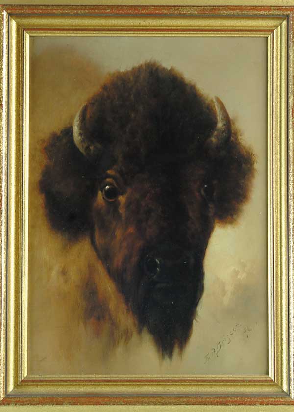 OIL ON PANEL PORTRAIT OF BUFFALO BY NOTED ARTIST FRANKLIN DULLIN BRISCOE. Theme depicts of a nicely rendered head of a buffalo in portrait format. Signed in lower right: F.D. Briscoe, 96. Briscoe was born in 1844 and died in 1903 and was known for his marine mural animal and portrait paintings. A very nicely done and with a nice Western flavor. IMAGE SIZE: 13-1/2” w x 19-1/2” h. Framed in a gold wooden frame. CONDITION: Very good to excellent. 8-87193 (1,800-2,800)