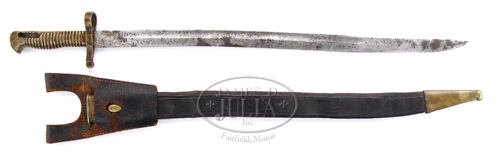 CONFEDERATE SABER BAYONET. This bayonet, thought to be made by Louis Froelich at the Confederate States Armory, Kenansville, North Carolina, is complete with its orig Confederate-made scabbard and frog. This is the only example of the Froelich scabbard we know of that has ever been sold at auction. Blade is 21-1/2″ long. Hilt, like other specimens, is ribbed and unmarked. Bayonet is missing spring and button. Scabbard is top sewn with brass throat and brass drag. Throat retains a teardrop-shaped frog button with its orig sewn frog. Mr. Michel’s Notes State: “Confederate saber bayonet manufactured by Louis Froehlich of the Confederate States Armory in Kenansville, North Carolina in original scabbard. Long, 21½” blade with unstopped fuller extending from the ricasso to some 6” from the tip. The hilt is unmarked and is missing the stud lock and stud lock spring. The full length, original scabbard is top sewn with a brass throat and tip. The top throat has a teardrop-shaped stud to hold the waist belt frog, which is also present and still intact.” PROVENANCE: Ben Michel collection. CONDITION: Blade is gray with scattered staining and pitting. Blade is loose in hilt. Hilt has numerous dings and scratches and is missing spring and button. Scabbard body is solid but dry. Frog is solid, crazed, with some loss of black surface. Orig drag is resoldered/braised at seam and cleaned. Throat is untouched and exhibits nice patina. 4-31331 JS22 (4,000-6,000)