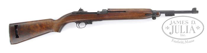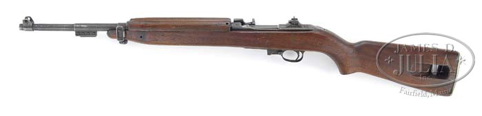 *CONSECUTIVELY NUMBERED PAIR OF INLAND M-1 CARBINES. SN 248815, 248816. Cal. 30. GUN 1: 18″ bbl. This February of 1943 Inland shows some orig components along with some arsenal upgrades. Components are as follows: Barreled action shows orig February of 1943 with correct front and rear sights, but does retain an “AMCO” Type 3 bbl band and bayonet lug upgrade. Bolt is a transition bolt which is a flat blued “AI” marked bolt with a standard blue extractor. Trigger housing retains all orig Inland components, including a push-button safety and Type 2 dog-leg hammer. The correct mounting pin is missing the spring. Operating slide is Type 1 with the butt stock and handguard having been upgraded. Butt stock shows to be an oval-cut, low-wood with the broken wheel cartouche and an “RIA” over “EB” stamp. Upper handguard assembly is a 2-rivet Underwood. GUN 2: 18″ bbl. This gun shows slightly better than gun 1, retaining orig sights with the same Type 3 bbl band/bayonet lug upgrade with the “JMQ” code on it. Trigger housing and components are correct for the February of 1943 production date, including a push-button safety and Type 2 dog-leg hammer, but retains a slightly later cross pin. Operating slide is Type 1 early Inland, as it should be, and the blued flat bolt is “AI” marked retaining a standard extractor. Butt stock is the correct “I” cut/high-wood with “IO” and an ordnance bomb in the channel. The “IO” marked, 2-rivet upper handguard shows to be a small groove, which is correct for this transition period. PROVENANCE: Tom Clinton Collection. CONDITION: GUN 1: Receiver retains approx. 85% of the orig finish with the majority of loss being at the wood line. Bbl retains approx. 90% of the orig finish showing signs of being in a scabbard or a rack. Trigger housing and operating slide each show better than 95% of their orig finish. Butt stock and handguard both show good-plus with just a little minor bruising. Orig “AI” flat bottom magazine shows near-excellent. Mechanics are crisp and bore is bright although it shows some wear. GUN 2: This barreled action retains better than 95% of the orig dark gray parkerized finish, as does the trigger housing and slide assemblies. The magazine catch and pins show blued, while the hammer shows in the white with the plunger being blued. Butt stock shows good-plus with only a few minor scuff marks present and a barely legible circle “P” on the pistol grip. Butt stock also retains a rack number “3 43”. Upper handguard shows good with a small “ACRA-GLASS” repair on the right side approx. 1″ from the rear. Mechanics are crisp and the bore is bright and shiny. Correct Inland magazines on both guns are in very good condition. 4-37362 BK15 (3,500-5,500)