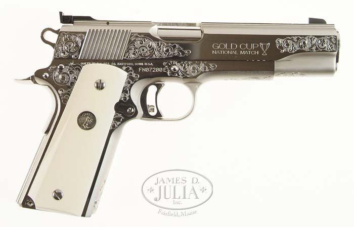 *FACTORY ENGRAVED COLT MARK IV SERIES 80 GOLD CUP NATIONAL MATCH SEMI-AUTO PISTOL. Cal 45 ACP. SN FN07200E. Nickel finish with usual National Match Gold Cup configuration, silver medallion smooth ivory grips. It has partridge front sight & Elliason adjustable rear sight with skeleton hammer & beavertail grip safety. It is engraved with B or C coverage foliate arabesque patterns with punch dot background. Accompanied by one nickel magazine & orig molded carry case with owner’s manual. CONDITION: New in box, probably unfired. 4-55591 ET6 (1,000-1,500)