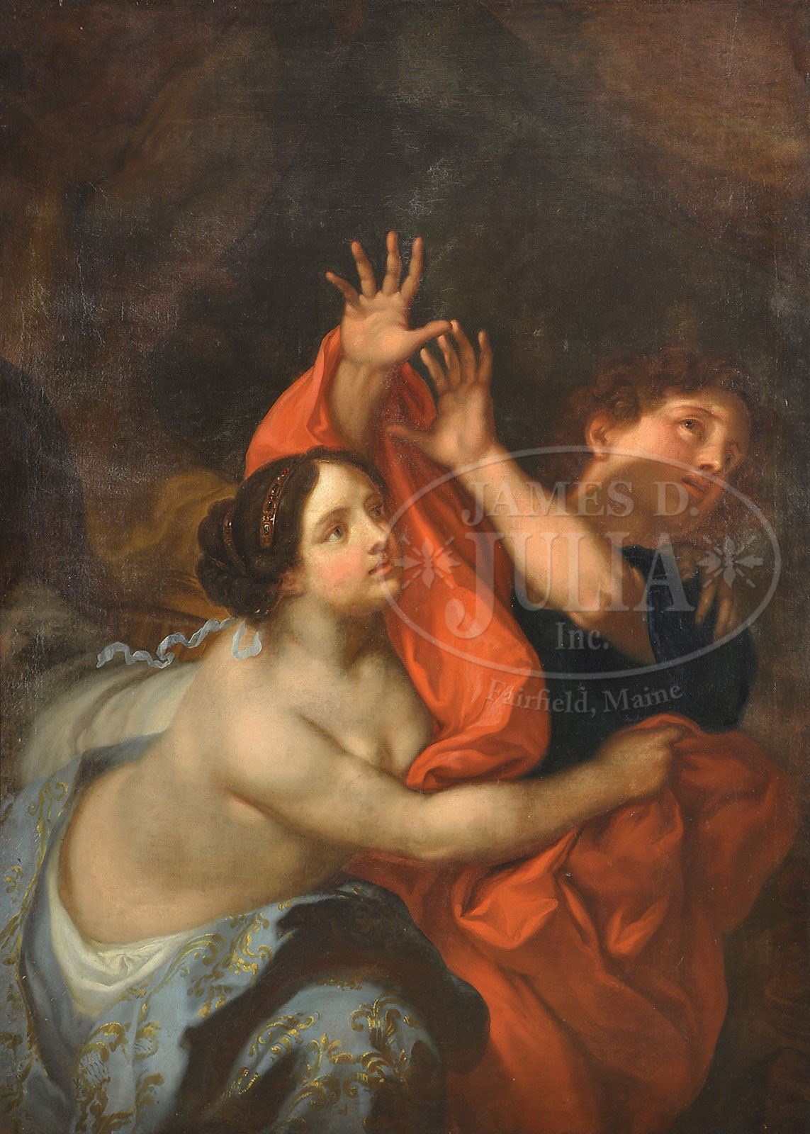 SCHOOL OF CARLO CIGNANI (Italian, 1628-1719) JOSEPH AND POTIPHAR’S WIFE. Oil on canvas Unsigned, 17th/18th Century Unframed SIZE: 56-1/4″ x 40-1/2″ PROVENANCE: From a California Collector; Christie’s East 5/30/90 CONDITION: Wax lining, restored 7-70297 (3,000-5,000)