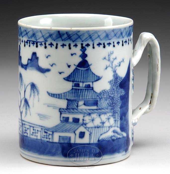 CHINESE EXPORT CANTON MUG WITH STRAP HANDLE. Mid 19th C. Strap handle and typical blue and white Oriental design overall. SIZE: 4-3/4″ h. CONDITION: Very fine overall with no visible damage or restoration. 9-91435 (400-600)