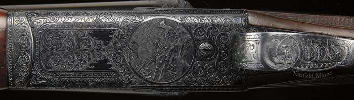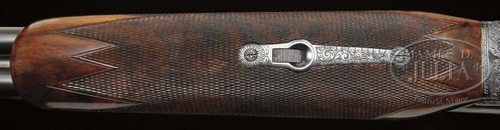 *SUPERB FACTORY ENGRAVED WINCHESTER MODEL 21 TWENTY GAUGE DELUXE SKEET GUN WITH EXTRA BARRELS AND CASE. SN 24470. Cal. 20 ga. 2-3/4″ Chambers. 26″ and 28″ Ventilated rib bbls. 26″ bbls are choked “Skeet 1 and 2″. 28″ bbls are imp mod and full. Originally finished May 12, 1949, as a Deluxe Skeet grade, with all features matching this particular gun, except stock dimensions. August 1952 repair order specifies that the gun should be engraved in 21-6 style. This was completed and gun presently exhibits 3″ triangles of shaded scroll on breech ends of bbls, and classic John Kusmit engraving of shaded scrollwork, with setter and pointer in ovals, on either side of action, and pair of pheasants on trigger plate. Portrait of a spaniel is on trigger guard bow. Fences are relief engraved with oak leaves. Action features non-automatic safety, selective single trigger, and automatic ejectors. XXX crotch figured American walnut full capped pistol grip buttstock measures 14″ over red Winchester pad and features deluxe 20 LPI checkering with beaded borders. Matching beavertail forend has typical release and SN on wood and engine turned metal. 26″ Bbls: Bore diameter: left-.614, right -.611. Bore restrictions: left -.007, right -.000. Wall thickness: left -.017, right -.025 Drop at heel: 2-1/2″, drop at comb: 1-9/16″. Weight: 6 lbs. 15 oz. LOP: 14″. 28″ Bbls: Bore diameter: left-.614, right -.615. Bore restrictions: left -.011, right -.020. Wall thickness: left -.027, right -.025. Drop at heel: 2-1/2″, drop at comb: 1-9/16″. Weight: 7 lbs. 1 oz. LOP: 14”. Newly made, high quality, brown oak and leather case with brass corners, is lined with burgundy cloth with gold embossed black leather Model 21 label. Partitions have nicely mitered wood tops. Case contains oil bottle, and black leather case with cleaning brushes and 2-pc brass and rosewood cleaning rod. Case has tan canvas leather trimmed outer cover with zipper closure. PROVENANCE: Copies of Cody Firearms Museum letter and fax with specs for this gun and stating it was made for Stratton and Tiestuggs Co, Inc. CONDITION: Excellent, as finished by factory in 1952. Bbls retain nearly all of their satin black, with a few minor marks and scuffs. Blue of action is slightly silvered on fences and sharp edges. Stock retains what appears to be most of its varnish finish. Bores are excellent. Action is tight. Ejectors are in time. Trigger works. Case is excellent, near new. 4-46052 MGM307 (35,000-55,000)