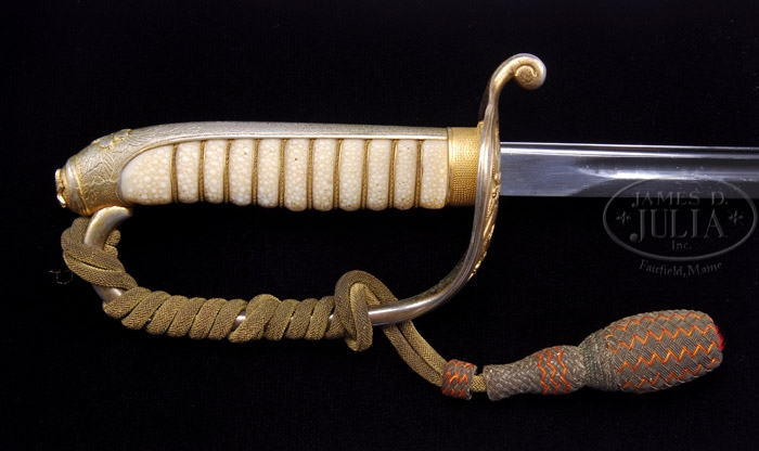 WWII JAPANESE POLICE SWORD GIVEN TO THE LATE ACTOR LEE MARVIN BY THE FAMOUS JAPANESE ACTOR TOSHIRO MIFUNE. SN NSN. Standard police sword with 29-1/2″ slightly curved narrow blade with dbl fullers, white fish skin handle with gold wire wrap, D-guard knuckle bow and hand guard with chrysanthemum decorations. Back of handle & pommel cap are also decorated with raised chrysanthemums. Accompanied by its orig black leather covered scabbard with gold washed hangers & drag that have raised chrysanthemum decorations. Knuckle bow is mounted with a gold & silver with red piping sword knot. Mrs. Marvin states that this sword was gifted to Lee Marvin by the famous Japanese actor, Toshiro Mifune (star in Shogun) after their collaboration in the TV Series Shogun and just before their 1968 movie Hell in the Pacific. Accompanied by affidavit from Mrs. Lee Marvin stating that this pistol was Lee Marvin’s. PROVENANCE: The late actor Lee Marvin. CONDITION: Very fine. Blade is clean & bright with the handguard & back strap and all the scabbard fittings retaining most of their orig gold wash, slightly thinned on the handguard & handle. Sword knot is lightly soiled but fine. 4-38933 JR115 (500-1,000)