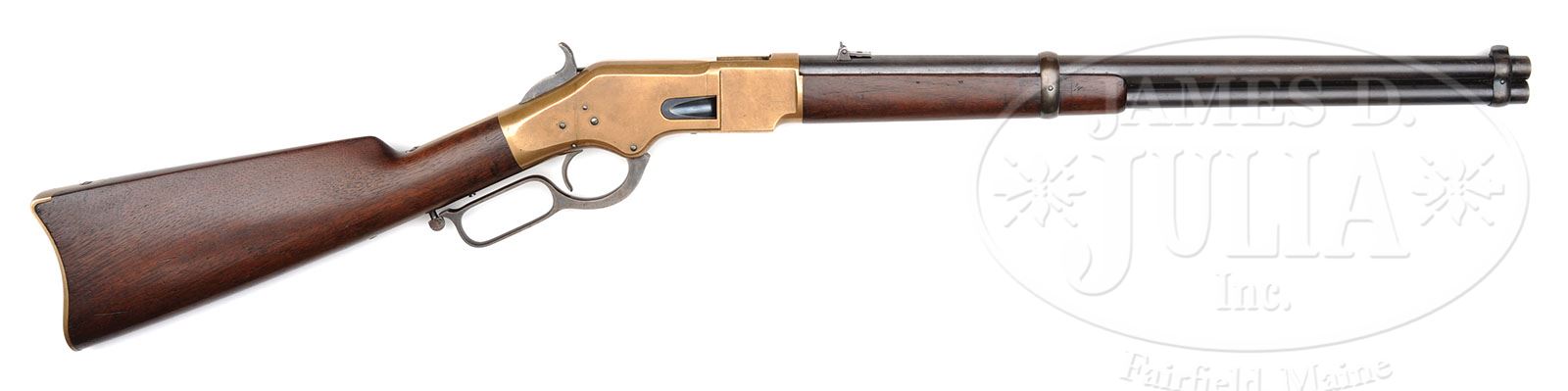 FINE WINCHESTER MODEL 1866 SADDLE RING CARBINE. SN 126975. Cal. 44 RF Henry. Standard carbine with 20″ rnd bbl, full magazine, integral front band/front sight & 2 position flip rear sight. Forearm band is thick first type & left side of receiver has a staple & ring. Mounted with nicely figured, uncheckered, straight grain American walnut with straight stock & brass buttplate with trap containing an orig 3-pc brass & steel cleaning rod. Stock & buttplate have last four digits of matching SN. This carbine was produced in 1876 at the very height of the Great Westward Expansion of Manifest Destiny when any cartridge firearm was in great demand by the pioneers. Model 1866 rifles & carbines were extraordinarily popular & usually saw extensive hard service frequently with little or no maintenance and are rarely found today with high orig finish. CONDITION: Extremely fine, all matching including stock & buttplate. Bbl, magazine tube & bbl bands retain strong orig blue with about 1/3 of the middle section of the bbl a plum blue/brown patina. Receiver and buttplate retain sharp edges & a crisp medium to dark mustard patina. Loading gate retains most of its orig fire blue. Lever & hammer retain strong case colors on the sides with traces of case colors on the edges. Bolt & bolt face also retain some factory blue with bright blue on the extractor. Wood is sound with light nicks & scratches and retains most of its orig oil finish. Mechanics are crisp. Bright shiny bore with a few small spots of pitting. Cleaning rod is extremely fine. 4-49591 JR148 (20,000-30,000)