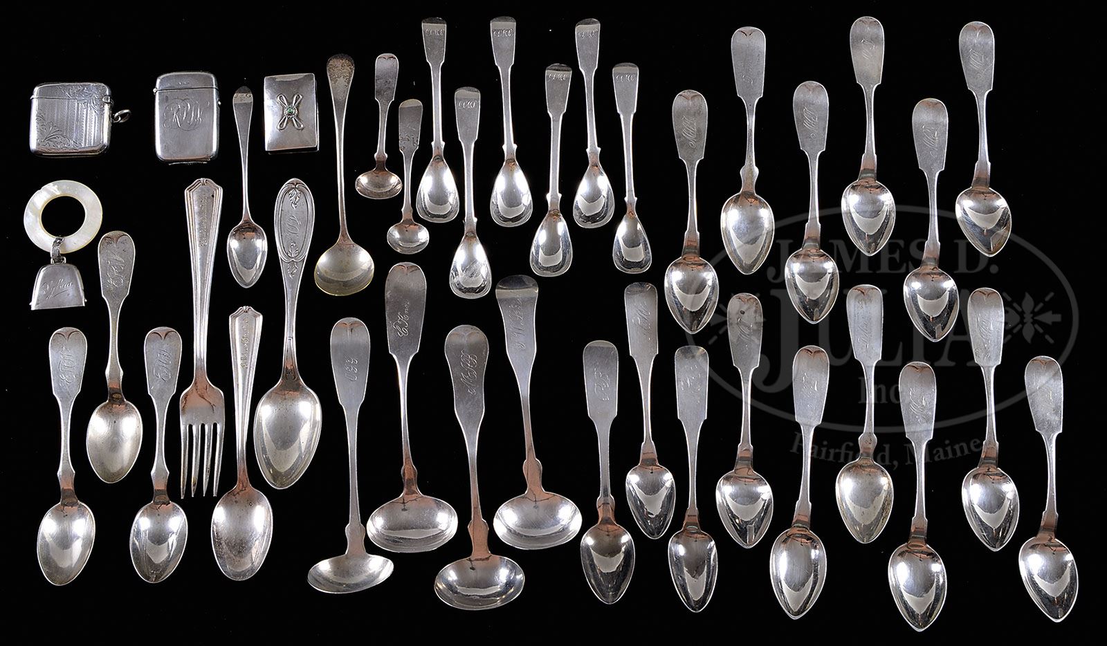 LARGE LOT OF STERLING AND COIN SILVER. Lot consists of 2 fish knives, button hook & shoehorn with matching sterling silver handles, fingernail file with sterling handle, Tiffany & Co. carving set with sterling handles, sterling and Mother of Pearl teething ring, 3 dresser brushes with sterling backs, one sterling & one plated match safe, sterling silver scissors & letter opener in matching case, 29 coin silver spoons & small ladles by various makers, 3 sterling silver serving forks, 2 sterling silver small ladles, 3 sterling sugar shells, one sterling jelly spade, one sterling salt spoon, 12 sterling demitasse spoons, 2 sterling sugar tongs, S. Kirk & Son serving spoon & fork, 12 sterling oyster forks, 2 sterling serving spoons, 26 miscellaneous sterling teaspoons, Whiting sterling silver pierced basket with handle, pair of melon shaped salt & peppers, ornate silver overlay flask, engraved glass bowl with sterling silver rim, small sterling silver bowl, 2 small sterling silver trays, sterling silver child’s cup, Mexican sterling silver pillbox, pair of weighted sterling silver candlesticks, Sheffield plate muffinier, collection of 7 souvenir spoons, five of them are sterling silver, and an unusual Russian silver inscribed book cover with 3 faceted garnets. Total weight of sterling silver is 86.4 troy ounces. Weight is for solid sterling items only. It does not include items with sterling handles and steel blades or coin silver items. CONDITION: Overall very good to excellent. 5-66983 (1,000-2,000)
