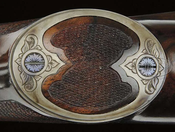 *ROGER FERRELL CUSTOM MODEL 70 WITH SCOPE. SN G154031. Cal. 7 mm Weatherby Magnum. Lightweight tapered octagon bbl is marked “R. Ferrell Gunmaker” on top flat, and with caliber on left rear of bbl which also has one broad and one narrow inlaid gold band. Another band is at muzzle. Finely polished and finished Model 70 claw extractor action has four checkered and gold outlined teardrop panels with floral termination to bolt knob. Blackburn bottom metal has hinged floorplate with button release in trigger guard bow. Metal polishing and treatment on this fine rifle is exceptional. Besides the satin rust-blue finish on bbl, receiver, and bottom metal, the custom scope mounts are color hardened. Scope rings and extractor are heat blued, all to very pleasing effect. Metal parts are engraved with about 40% coverage of cleanly cut shaded scroll and acanthus, with scrolled gold highlight on trigger guard bow. Central medallion of bottom metal portrays relief gold inlaid white tail buck bounding through gold wire oval. Engravers signature “Glimm Engr.” is on front of floorplate. Striking, darkly marbled thin shell walnut stock, with broad quilted figure, measures 13-7/8″ over Silvers type pad, and features shadow line right hand cheekpiece, cocobolo forend tip, and 24 LPI classic point pattern checkering with mullered borders. Stock is crisply sculpted with beautiful hand rubbed oil finish. Case hardened steel furniture includes engraved recoil bolts, skeleton grip cap, and sling loops in-letted into raised oval islands in the stock. Gold oval on toe line is engraved with initials “AA”. Leupold Vari-X III 3.5 – 10 X scope has duplex reticle. Drop at heel: Approx 2-1/2″, drop at comb: Approx 2-1/4″. Weight with scope: 8 lbs. 10.6 oz, LOP 13-7/8″. CONDITION: Virtually as new, with only one or two very minor marks in wood. 4-41211 MGM48 (12,000-15,000)