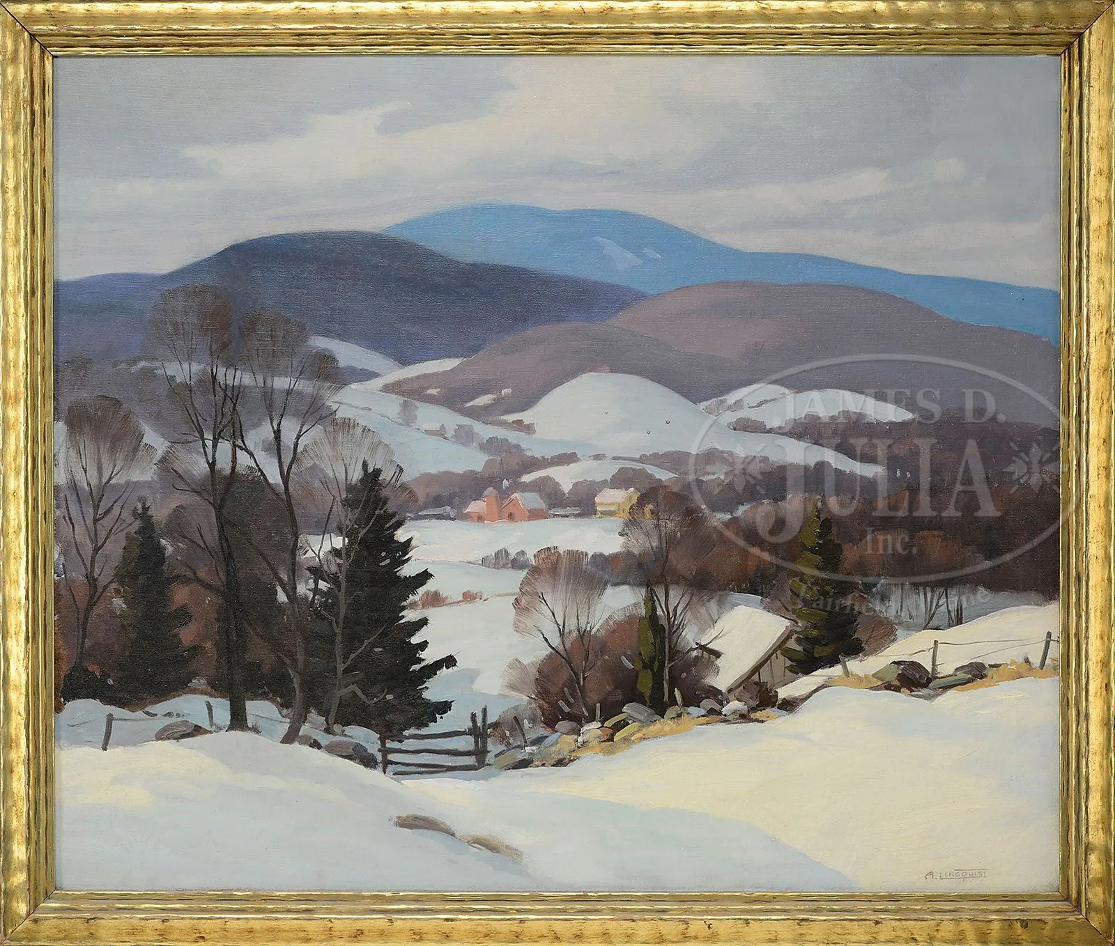 ARTHUR LINGQUIST (American, 1889-1975) ROLLING HILLS OF VERMONT. Oil on canvas Housed in a gilt molded wood frame Signed “A. Lingquist”, lower right SIZE: 30″ x 36″. Overall: 33-1/2″ x 39-1/2″ PROVENANCE: The John F. Gale Collection, Cambridge, MA CONDITION: Relined with wax reinforcement, scattered inpainting and craquelure, otherwise good 9-27393 (1,200-1,800)