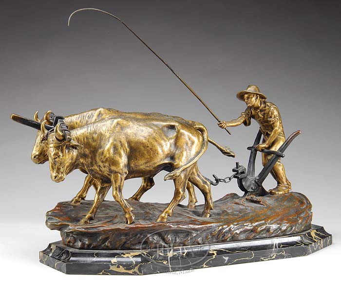 EDOUARD DROUOT (French, 1859-1945) “PLOWING”. Circa 1895 bronze having a brown-yellow patina shows a man with plow and two oxen team plowing a brown field. He has a long whip in his hand. Bronze is mounted to a black variegated marble molded edge plinth. Ref.: Pictured pg 660, Vol 3, Harold Berman Bronzes. SIZE: 11-1/2″ h x 26″ l x 8″ w (without marble). Marble 1-1/2″ h. PROVENANCE: Christies 4/19/88. CONDITION: Very good. 9-93768 (1,500-2,500)