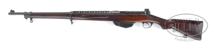 *RARE PEDERSEN RIFLE BY VICKERS-ARMSTRONG OF ENGLAND. SN 93. Cal. 276. 24″ bbl. The Pedersen rifle was manufactured by Vickers-Armstrong, Ltd., in England. These semi-auto rifles operate on a toggle / bolt system that is similar to that on a German PO8 or an American Browning automatic rifle. These rifles were submitted for testing to the U.S. government in the early 1930’s, along with the M-1 Garand and several other entries. It is rare to find one in orig unmolested condition. This example is SN 93, and it is 100% complete and in excellent working order. This rifle was also made in 30 caliber in a very limited quantity. CONDITION: Barreled receiver shows better than 95% of the orig blue finish, with the bands and trigger guard showing slightly better. The magazine shows slightly less blue, retaining approx. 90%. The 1-pc butt stock assembly shows good-plus, with some light bruising throughout but nothing significant enough to detract from its presence. Mechanics are crisp, and the bore is very lightly frosted but with very strong rifling. 4-37676 (6,000-9,000)