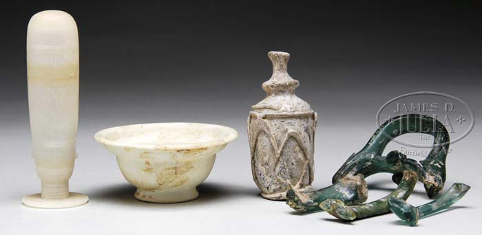 LOT OF ANCIENT VESSELS & SHARDS. Lot consists of a grouping of ancient vessels including a carved alabaster vase with wide rim and rounded bottom with a 1″ hole broken on the side; a carved alabaster bowl which has been broken and reglued; an ancient glass bottle with applied thread design with some design missing, uneven bottom and heavily corroded; and four green glass portions of handles from an ancient vessel. Pieces most likely date from 100 to 600 A.D. SIZE: Tallest is 4-3/4″. PROVENANCE: From the Private Collection of Dorothy Lee Jones. CONDITION: As noted. 5-61731 (500-700)