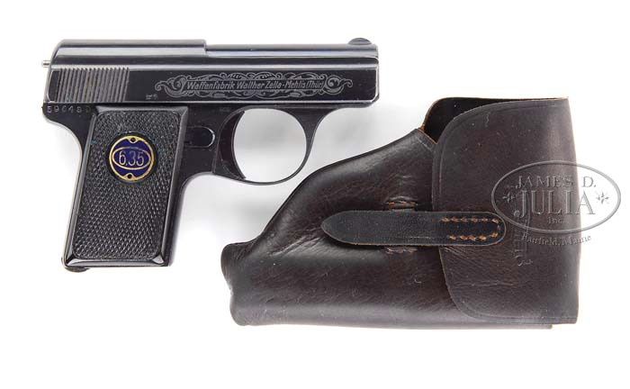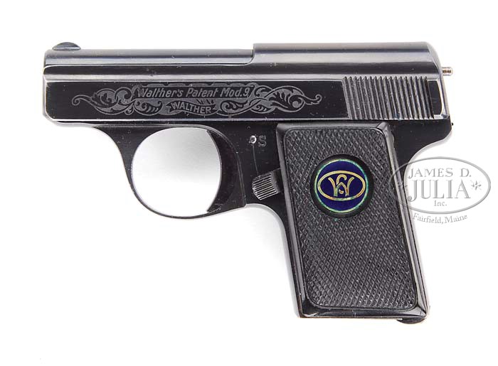 *RARE FACTORY ETCH ENGRAVED WALTHER MODEL 9 SEMI-AUTO PISTOL. SN 596480. Cal. 25 ACP. Blue finish with 2″ bbl, fixed sights and checkered black hard rubber grips with cloissonne medallions on each side. Slide is acid etch engraved on each side in foliate arabesque patterns around the slide markings. Slide & frame have crown “N” proofs. Accompanied by one orig Walther banner magazine. Also accompanied by a rare orig Walther banner marked soft leather flap holster with tab & loop and a belt loop on the back. Also accompanied by a small narrative from consignor who states that this pistol was carried under the tunic of a British soldier in Egypt. He apparently became infatuated with Mary Louise Ellsworth, wife of the famous American Antarctic explorer, Lincoln Ellsworth when she was in Cairo with her mother on an “around the world” trip for the teenage daughter of a Pennsylvania steel magnate. Mrs. Ellsworth kept the pistol until her death when she was in her 80’s. CONDITION: Extremely fine. Overall retains 97-98% strong orig factory blue with only slight muzzle edge wear on slide and a light safety line. Grips are crisp with only faint diamond point wear. Holster shows heavy handling and probably has been treated with Neatsfoot oil. Walther banner logo on flap is still legible. 4-39297 JR270 (750-1,500)