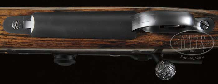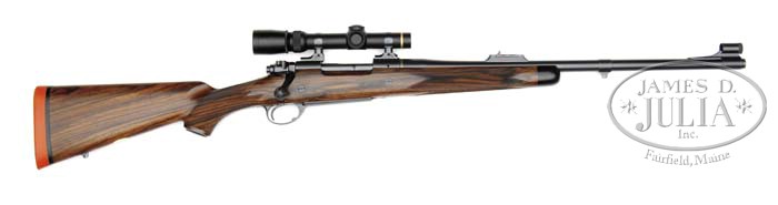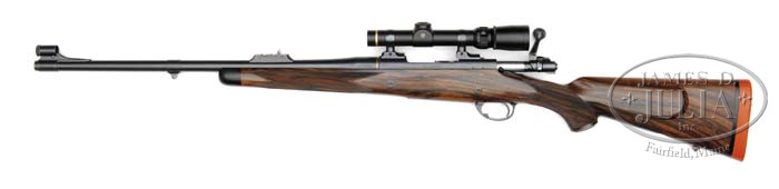 *ROGER FERRELL CUSTOM MODEL 70 WITH SCOPE. SN 513471. Cal. 35 Whelen. 22″ Round medium weight sporter bbl is fitted with sleeved-on sling loop and matted front ramp with longitudinally dovetailed gold bead. Knurled sight protector is held in place by spring detent. “ERA” express rear sight has one standing, two folding gold inlaid leaves for 100, 200, and 300 yards. Left rear of bbl is engraved “35 WHELEN”. There are two inlaid gold bands at breech, and one at muzzle. Typical Model 70 claw extractor action has been nicely polished, bolt body engine turned, knob engraved with floral tip and 4 checkered teardrop panels. Bolt stop release has been checkered. Blackburn bottom metal has floorplate release in bow. Action screws are engraved. Classically styled, flawlessly in-letted and shaped, darkly streaked English walnut stock measures 14-7/8″ over Silvers type pad, and features shadow line right hand cheekpiece, engraved steel grip cap, ebony forend tip, engraved action reinforcing bolts, and finely executed 22 LPI point pattern checkering with mullered borders, which wraps around forend. Sling eye and gold oval engraved “AA” are on toe line. 1-1/2 – 5 X Leupold Vari – X 3 Scope with duplex reticle is in SK mounts. Weight with scope: 9 lbs. 3 oz, LOP 14-7/16″. CONDITION: Excellent, close to new, retaining virtually all metal finish, and only a few, very minor, marks in stock. Bore is excellent. Scope is excellent, optics clear. 4-41214 MGM24 (7,000-10,000)
