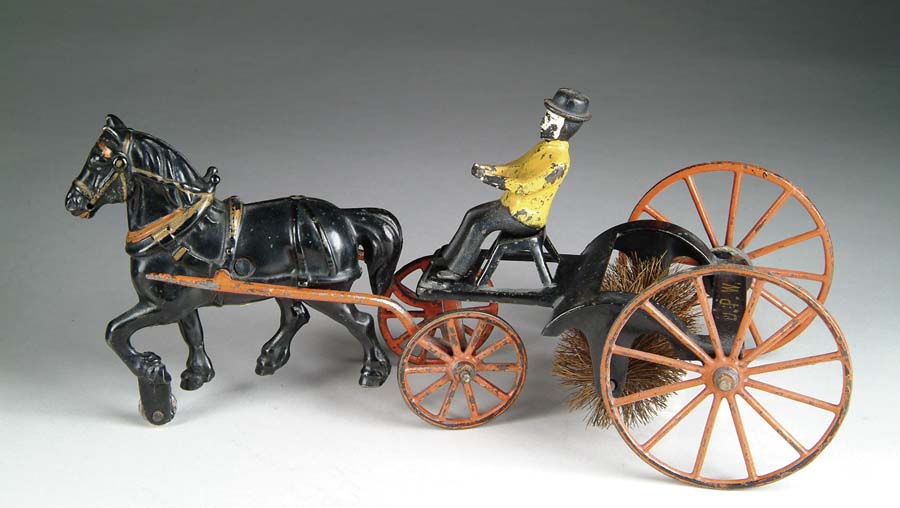 SCARCE WILKINS HORSEDRAWN STREET SWEEPER. A toy that was elusive to Bob & Jackie for many years until this one became available at the infamous Hegarty auction. A delicate casting encasing a circular brush. When pulled along floor it simulates the real life actions of an 1890’s street sweeper. Enameled in black with red yoke and wheels, the driver sits atop taking command of his horse. The rear of the sweeper is marked “D.P.W.” (Department of Public Works). SIZE: 12 1/2″. CONDITION: Very good to fine. JL 1-4136 (3,500-4,500) Auction: Advertising, Toy & Doll - Spring 2005 Please Note: All prices include the hammer price plus the buyer’s premium, which is paid by the buyer as part of the purchase price. The prices noted here after the auction are considered unofficial and do not become official until after the 46th day. |