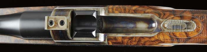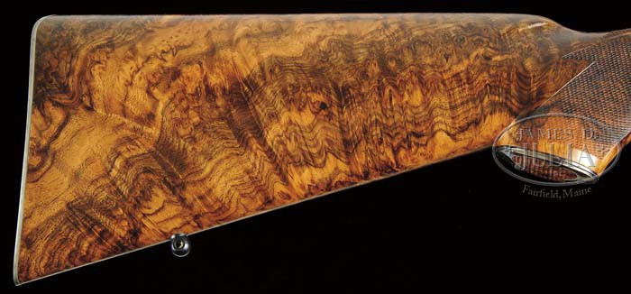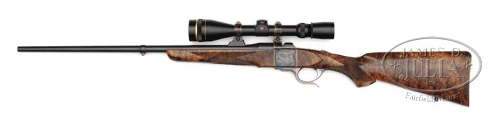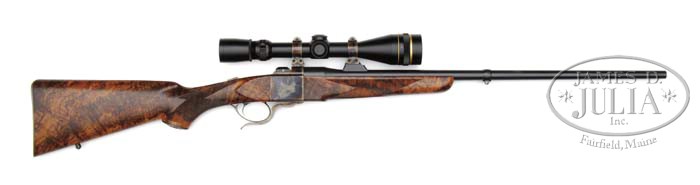 *DAKOTA ARMS MODEL 10 WITH EXTRA FANCY WOOD AND SCOPE. SN SS0658. Cal. 22-250 Rem. 24″ Lightweight sporter bbl with sleeved-on swivel loop band, is stamped “22-250 Rem” on left rear. Beautifully color case hardened single shot dropping block action with tang safety, is stamped “Dakota Arms 10 Sturgis, SD” on bottom. Truly spectacular flesh-toned burl Circassian walnut pistol grip buttstock measures 13-3/8″ over case hardened skeleton buttplate with checkered wood center. Stock also features a matching skeleton grip cap, and flawlessly executed 24 LPI borderless point pattern checkering. Matching forend attaches to bbl with screw. 4.5 – 14 X 40 mm Leupold Vari- X III Scope with duplex reticle is in color case hardened Talley detachable rings on custom Talley bases. Drop at heel: approx 2-1/4″, drop at comb: approx 1-7/8″. Weight: 7 lbs. .08 oz, LOP 13-3/8″. CONDITION: Excellent, near new. Metal retains essentially all its orig finish with a few wipe marks on right side of breech block. Stocks have a few minor marks. Bore is excellent. Scope is excellent, optics clear. 4-41208 MGM32 (7,000-10,000)