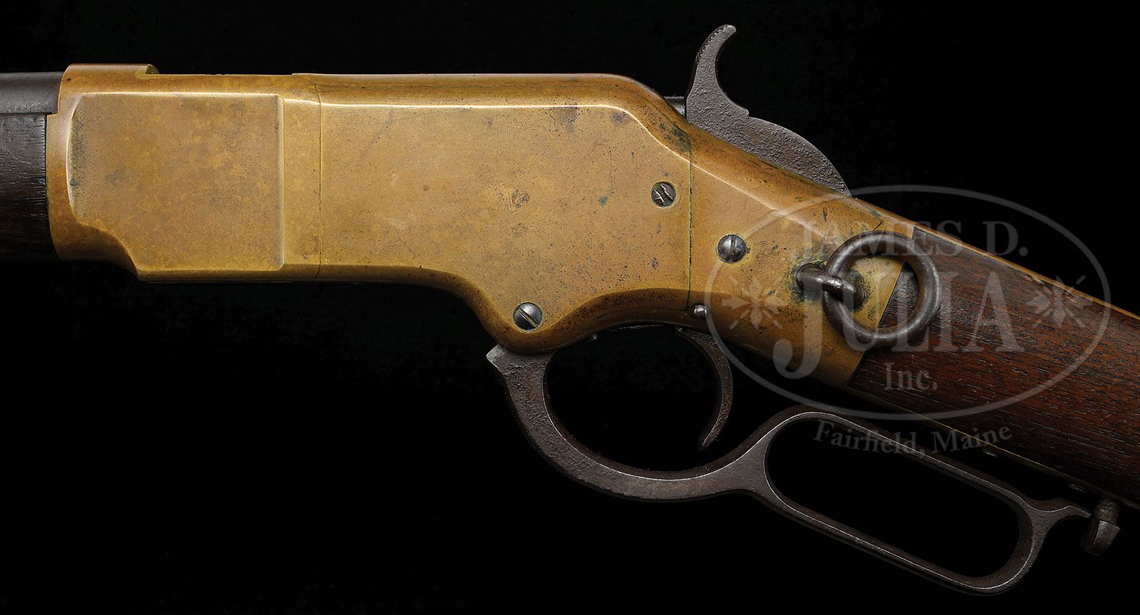 WINCHESTER MODEL 1866 SADDLE RING CARBINE. SN 23657. Cal. 44 RF Henry. Standard carbine with 20″ rd bbl, full magazine, integral front band/front sight, thick first-type forearm band & 2 position flip rear sight. Bbl has Winchester & King’s Patent 2-line address. Left side of the receiver has a staple & ring. Mounted with uncheckered, straight grain American walnut with straight stock & crescent brass buttplate with trap that contains a 3-pc brass & iron cleaning rod. These carbines were the first successful short repeaters & were immediately adopted for use on the American frontier & usually saw hard and continuous service under adverse conditions, rarely with any maintenance. CONDITION: Very good to fine. Bbl & magazine tube retain blue in sheltered areas with the balance a plum blue patina with moderate surface rust, probably from long term storage in a saddle scabbard. Receiver & buttplate have good edges with light nicks & scratches, tight side plates and retain a wonderful dark mustard patina. Lever & hammer also retain a dark brown patina. Bolt face is missing the center plug. Stock has a gouge in the comb with light nicks and scratches, shows moderate wear & retains a hand worn patina. Rod is fine with a dark plum patina. Mechanics are fine. Strong dark bore with moderate pitting. 4-48639 JR142 (5,000-8,000)