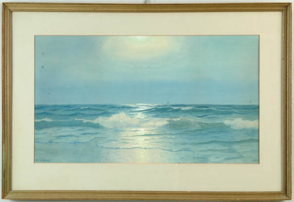 FRANK KNOX MORTON REHN (American, 1848-1914) THE SURF. Watercolor scene shows waves breaking onto beach with sailboat in distance. Bright sun reflects on area of crashing wave. Signed lower left “FKM Rehn”. Housed in a molded wood frame with white matte. SIGHT SIZE: 15-1/2” x 27”. CONDITION: Very good. 9-95732 (500-750)