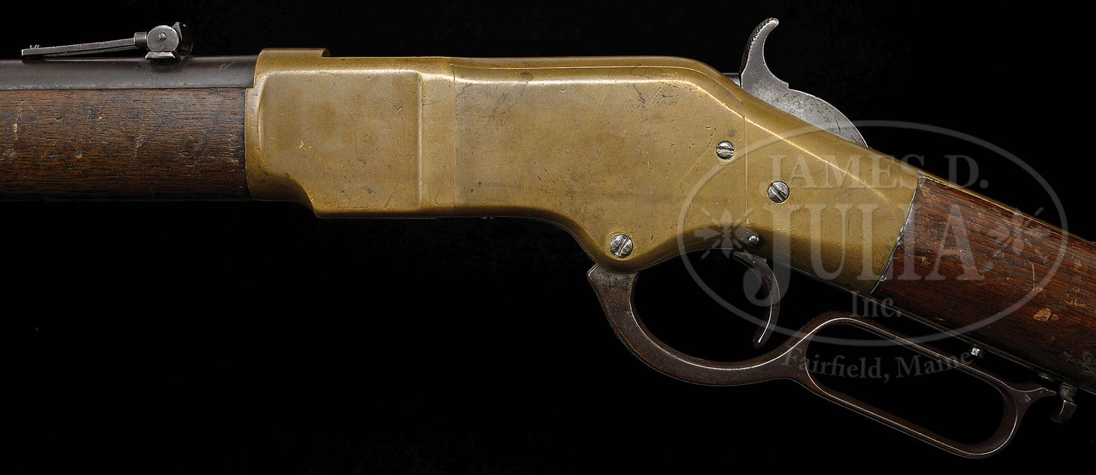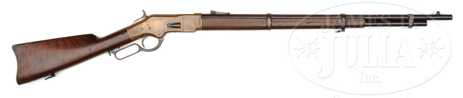 Stock and buttplate are old replacements. Stock is not numbered and buttplate has mismatched number. SCARCE WINCHESTER MODEL 1866 LEVER ACTION MUSKET. SN 41505. Cal. 44 RF Henry. Standard musket with 27″ rd bbl, full magazine & square base front sight with 900 yd Henry style ladder rear sight. Mounted with uncheckered straight grain American walnut with 3/4″ length forearm and straight stock with brass carbine/musket buttplate with trap. Rifle has 3 bands and has a saber bayonet lug on the upper band & sling wire on the middle band. Bottom of the stock has a corresponding factory sling swivel. Saber bayonet lugs on Model 1866 Muskets are somewhat rare with the bayonets for them even more rare. Winchester had hoped to get large military contracts for this musket & although the government did buy a few the large contracts never materialized. Muskets remained in production right through the end of this model with most being sold for Guard & Security forces. Turkey did buy a few of them to arm their military but never followed through with a large contract. CONDITION: Good to very good. Bbl, magazine tube & appended steel fittings retain a smooth, even brown patina. Middle and lower bbl bands have had their screws replaced with pins. Receiver & buttplate show moderate wear with light nicks & scratches and retain a wonderful dark mustard patina. Top of the receiver ring has a small casting flaw. Wood is sound showing heavy use with nicks, scratches & bruises. Buttstock retains most of an old restored finish. Forearm has a long scratch down the right side & retains a dark hand worn patina. Mechanics are fine. Strong bore with good shine and light pitting. 4-47638 JR146 (3,500-5,500)