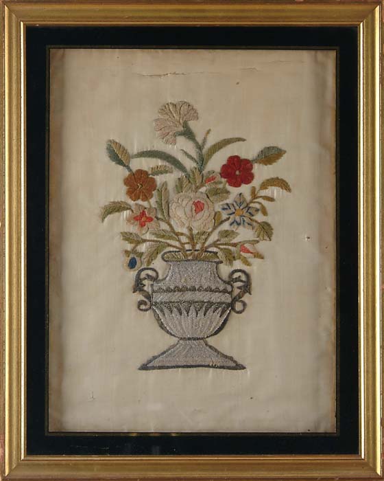 ENGLISH NEEDLEWORK CHENILLE AND BEADWORK PICTURE. A large two handled white and silver vase made of clear and silver beads with wire needlework edges and handles. A spray of flowers in colorful chenille work. All on a white silk background. Nicely housed in a shallow shadowbox frame with reverse painted border in black and gold. SIGHT SIZE: 18-1/4” x 13-3/4”. CONDITION: Generally very good, horizontal split to back top of silk background and one noticeable hole on right side. 9-27146 (800-1,200)