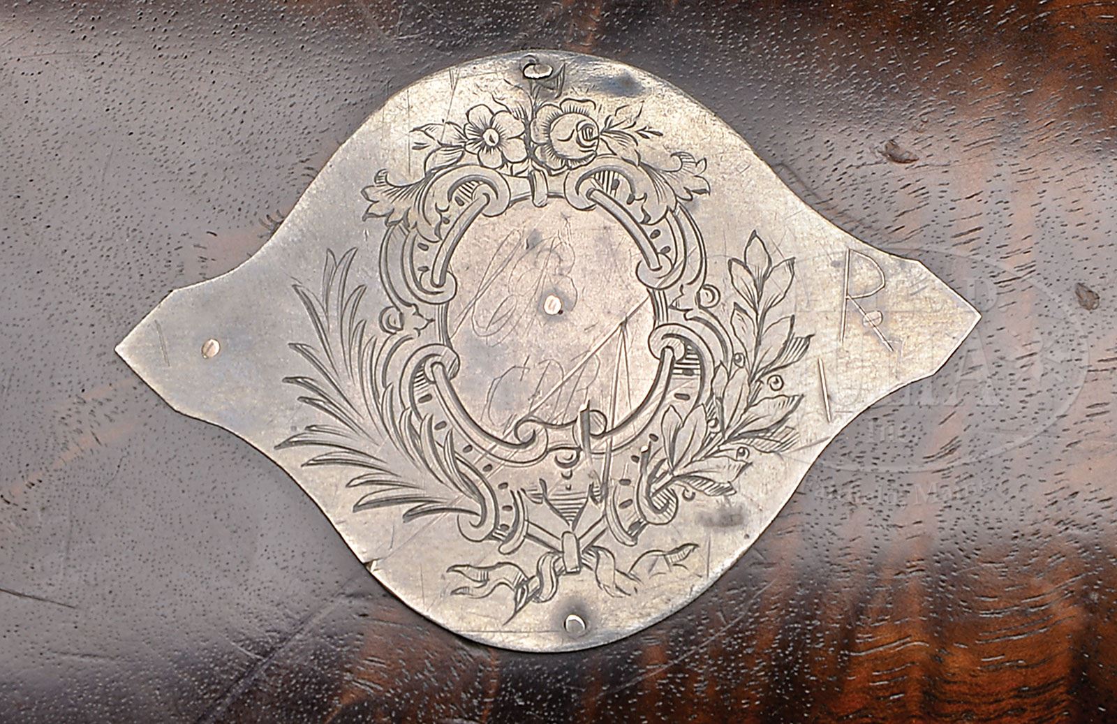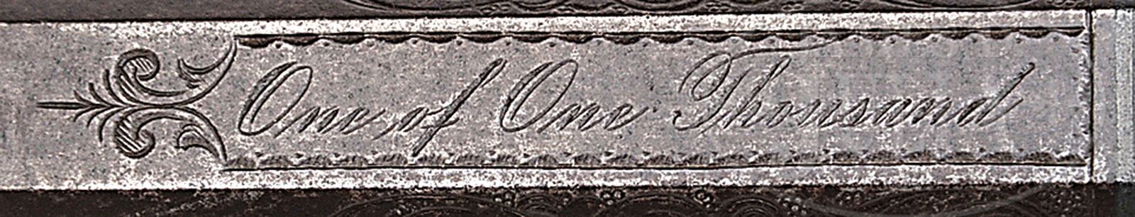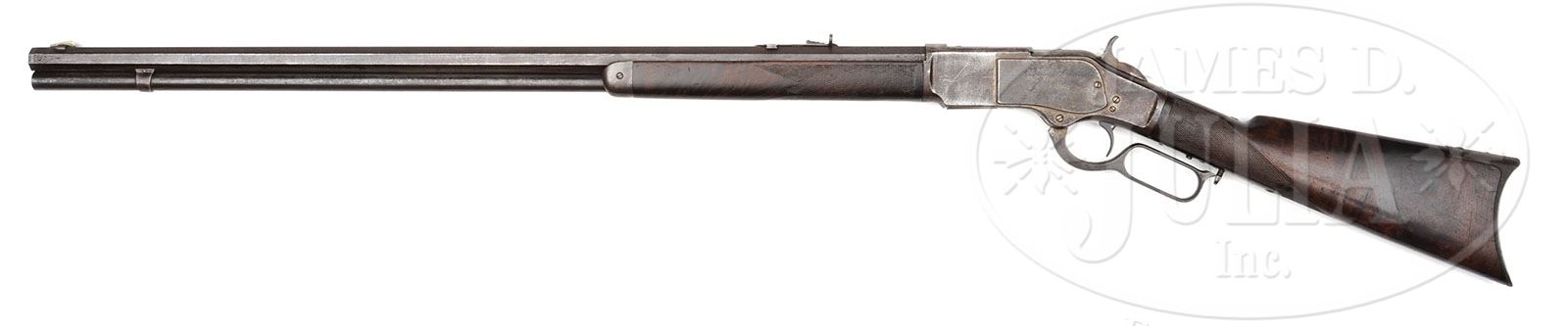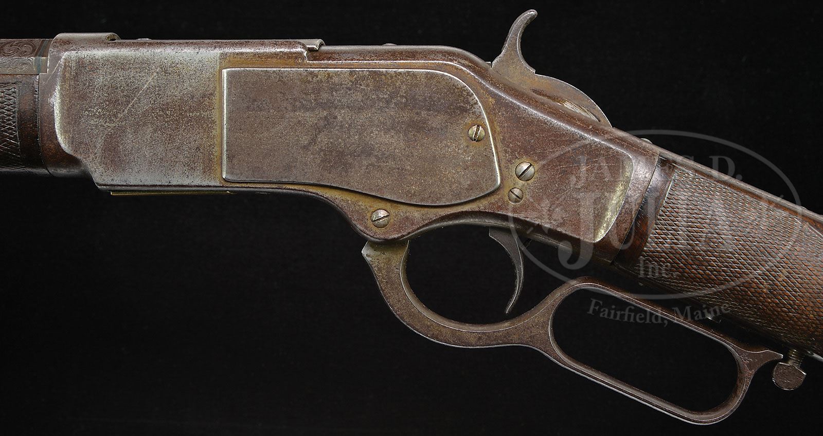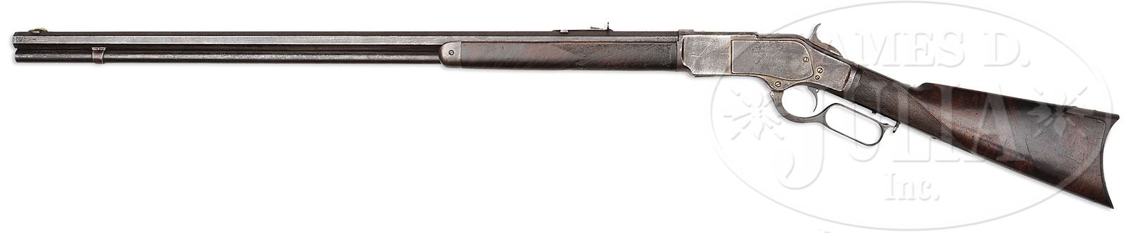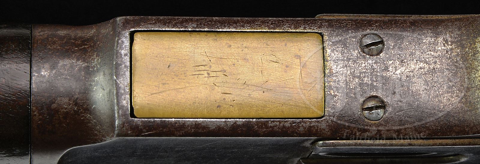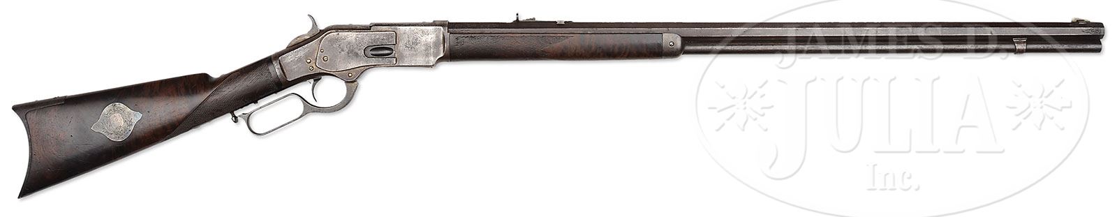 EXTREMELY RARE WINCHESTER MODEL 1873 ‘1 OF 1000’ LEVER ACTION RIFLE. SN 25827. Cal. 44 WCF (44-40). First model, 2nd type ’73, with 30″ oct bbl, full magazine, German silver Rocky Mtn. front sight and early style, short, semi-buckhorn rear sight with checkered edges. Receiver is first type with second type impressed thumbprint mortised dust cover. Mounted with 3-4/X center crotch, flame grain American walnut that has early style checkered forearm and straight stock with crescent steel butt plate. Right side of buttstock is inlaid with an unusual shaped silver plaque that is mostly round with pointed ears front & rear, 2-1/4″ wide x 1-5/8″ high, secured with five pins and beautifully engraved in acanthus & foliate patterns, with a blank initial panel in the center. Center is hand-scratched with two sets of initials which appear to be “CGB” and “CDB”. There is also an “R” on front ear. Receiver has sgl set trigger. Left side of lower tang is marked with assembly number “191” which number is also found in top tang channel of buttstock and inside toe of buttplate. Bbl, over the chamber area, is engraved in typical ‘1 of 1000’ style, having foliate arabesque patterns on the top, side and side flats and in script “One of One Thousand”. There is also a silver band adjacent to the receiver and another around the muzzle. Top flat and all exposed flats around muzzle are engraved to match. Accompanied by Cody Firearms Museum letter which identifies this rifle with 30″ oct bbl, set trigger, checkered stock, case hardened, ‘1 of 1000’, received in warehouse March 7, 1877 and shipped March 8, 1877 to Order #8474. The book The Story of The Winchester 1 of 1000 and 1 of 100 Rifles, Lewis, on p. 25 lists this rifle by SN with the above information. It also lists SN 25829 in identical configuration, shipped same day to same order. Pages 60 & 61 of the referenced publication discusses SN 25829 and pictures it with a windage adjustable Beech’s front sight and thick base tang sight. The caption states that #25829 was found in a second hand store in Redding, CA “where it lay among numerous junk guns”. This rifle, SN 25827, was similarly found, only very recently, in a small gun collection in Kentucky. According to a chart on p. 58 of Winchester The Golden Age of American Gun Making and the Winchester 1 of 1000, Wilson, of the 133 ‘1 of 1000’ Models 1873, there were only thirteen with 30″ bbls; 111 were case hardened, 112 were checkered, 120 had set triggers, along with other unassociated information. Page 84 of the Wilson book also pictures #25829. Both of the referenced publications state that there were 132 or 133 ‘1 of 1000’ rifles produced out of the approx. 720,000 Models 1873 manufactured between April 1875 and April 1893. Only a few of the ‘1 of 1000’ rifles out of that total are known today. CONDITION: Very good to fine, all matching. No orig finish remains being an overall mottled plummy/brown patina on the bbl, magazine tube & forend cap; receiver has been lightly cleaned with a thin mottled brown patina and traces of silvered case colors; lever, hammer & buttplate are also a dark brown patina with pitting on heel & tang of buttplate; set trigger needs adjusting and the dust cover may be an old replacement but, regardless, it is orig Winchester equipment. Stock has some tiny chips in the toe and a hairline in stock back of top tang, otherwise wood is sound showing heavy wear on the checkering with light nicks & scratches and retains a hand worn patina. Plaque in the right side is dark oxidized silver. Hammer will not hold at full cock when operated by the lever but will hold when cocked manually, otherwise mechanics are fine, strong, sharp bore with fine pitting. This is an opportunity for the collector to obtain an authentic & very real 1873 ‘1 of 1000’ without having to mortgage the property or sell the first born. 4-47859 JR122 (100,000-150,000)