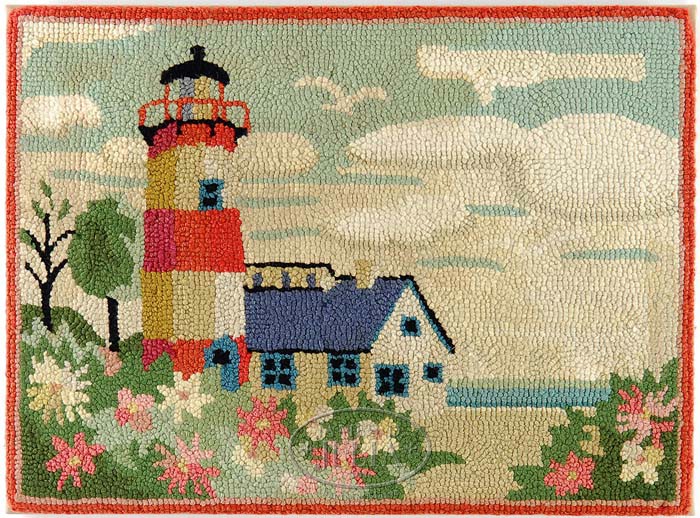 LIGHTHOUSE HOOKED RUG. Colorful hooked rug, mid 20th Century. Rug shows a colorful lighthouse with connected building with flower garden foreground, trees, seagull, cloud, blue sky and distant water. The small mat has been affixed to a material covered stretcher and is set for wall hanging. SIZE: 20″ x 26-1/2″. CONDITION: Very good. 9-95671 (300-500)