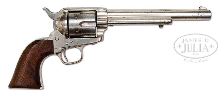 RARE BUY-BACK COLT CAVALRY SINGLE ACTION ARMY REVOLVER. SN 16293. Cal. 45 Colt. Nickel finish with 7-5/16″ slightly amputated bbl with damaged and altered front sight with 1-line script letter address with serifs. Left side of frame has 2-line patent dates and “U.S.”. Mounted with replacement, battered, 1-pc walnut grip with a number “1982” in the backstrap channel. Last 4 digits of matching SN are found on bottom of bbl under ejector housing and on cyl. Ejector housing is 1st type with bullseye ejector rod head and the base pin is orig type with dimpled ends. Hammer spring is a replacement with roller groove. Bbl, trigger guard, backstrap and cyl all have tiny “L” (Samuel B. Lewis) sub-inspector initials. Pg. 39 of Colt Cavalry and Artillery Revolvers..A Continuing Study, Kopec & Fenn, lists several nickel plated cavalry revolvers in the 15,000 to 19,000 serial range with this revolver falling between #16129 and #16352, both of which are Lewis inspected. It is well documented that there were large numbers of brand new cavalry Single Actions resold to Colt which were then nickel plated and sold on the civilian market. This is especially true and well documented that the State of Virginia Militia who received the majority of the Lewis inspected Single Actions sold them to the H. Boker firm in unissued condition. They also resold some of these unissued revolvers back to Colt. Accompanied by a 2 page letter from renowned Colt authority and author John Kopec wherein he covers some of the above information. PROVENANCE: Wes Adams Estate Collection. CONDITION: Good to very good, all matching except grip, as noted; overall retains 88-90% strong factory nickel with 2 spots of heavy blood-type pitting on the bbl and front sight with a few other scattered losses; cyl is mostly a gray patina with fine pitting on outer diameter with strong nickel in flutes; ejector housing and ejector rod head also have small spots of heavy pitting; grip has chipped toes and is badly battered with a hand worn patina; hammer is not solid in safety notch, otherwise mechanics are fine; strong bore with moderate pitting. 4-44711 JR271 (3,000-5,000)