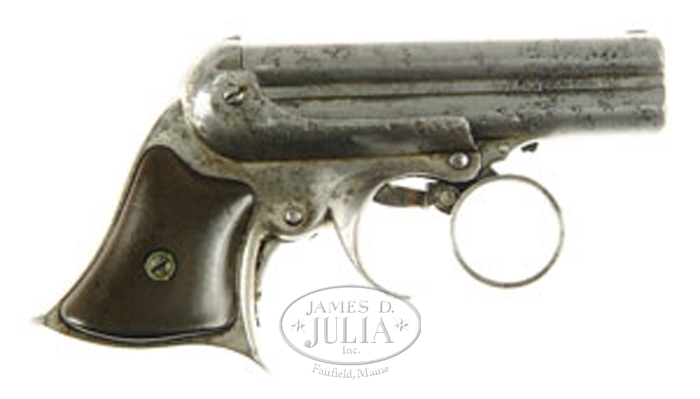 REMINGTON ELLIOT FOUR-BBL PISTOL. Cal. 32RF. SN 7474. 3-5/16”ribbed bbls. Standard markings on both side ribs are only partially readable due to pitting. Gutta percha grips. CONDITION: 75% of the nickel-plating remains on the left and rear of the pistol. Right side is deeply pitted. Grips are worn on the high spots. Sears spring is missing but the gun is otherwise functional. 4-56438 (450-650)