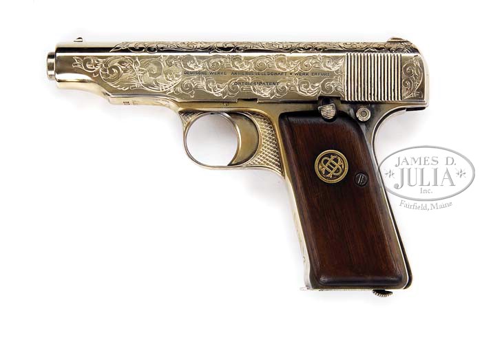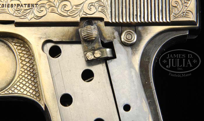 *SCARCE ENGRAVED ORTGIES SEMI-AUTO POCKET PISTOL. SN 71823. Cal. 380 ACP. Gold finish with 3-3/8″ bbl, fixed sights and mounted with smooth walnut grips with brass medallions. Pistol is engraved in European style with leaf & vine patterns mixed with arabesque scrolls and has a partial shaded background. Front strap, trigger bow & bottom front of the frame are engraved in foliate patterns and sides of trigger guard are engraved in diamond patterns. Most unusually, this pistol has an added manual slide lock/safety device built into the side of the frame and extending through the top of the left grip with a safety notch and a hold-open notch in the bottom edge of the slide. This device appears to be an experimental or prototype and has a small “S” on the flat arm below the serrated button. Usually Ortgies pistols are without slide lock or thumb safety, relying only on the grip safety. Bbl, slide & frame have crown “N” proofs and bottom front of frame is marked “Germany”. CONDITION: Fine. Overall retains about 95% strong orig gold wash, possibly over silver, with slight muzzle edge and grip safety wear. Left grip has a hairline in top front edge, otherwise grips are sound and retain a hand worn patina. Mechanics are fine, bright shiny bore. 4-39274 JR307 (1,500-2,500)