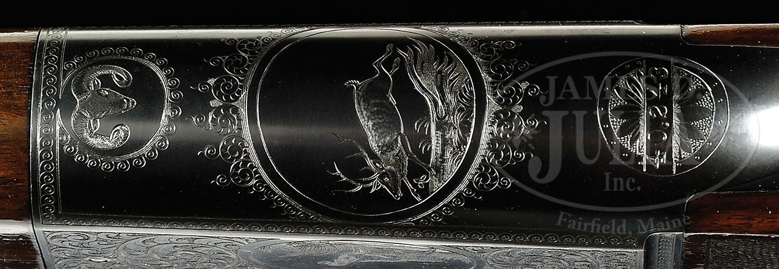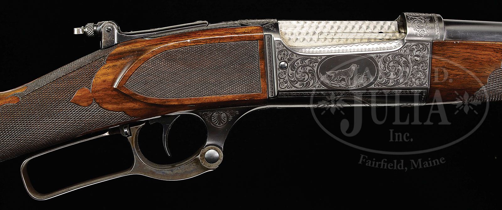 *RARE FACTORY ENGRAVED SAVAGE MODEL 1899 EXHIBITION RIFLE. SN 40243. Cal. 303. 26″ full rnd bbl, Beech’s front sight, Lyman 2-leaf rear sight and folding tang sight. Gun is fitted with factory installed brass chamber plug – for use in public displays. This is one of the left over frames from the 95’s that Marlin had manufactured for Savage. Featuring 7 different engraving vignettes that Marlin was known to use. The scroll work is also typical of one of Marlin’s engravers, probably Ulrich. Blue on gun is also very similar to what Marlin would have used. Savage’s factory records are blank on this SN, leaving one to presume assembled from parts and not for resale. Orig straight stock checkered deluxe wood stocks have most orig lacquer remaining and sharp checkering, what appears to be a Rampant Colt style hard rubber shotgun style buttplate, which cataloger is positive is correct and original to gun. Gun would prove to be the most elaborate Model 1895 based guns ever produced. This gun was supposedly part of the Alan Mabe collection in the 1950’s Mr. Mabe’s collection of Savage arms was the most extensive collection of its type in private hands done at that time. This very gun is listed in the magazine article discussing Savage Model 99 rifles. In this article it listed 21 special firearms from the Mabe collection. This firearm was one of the ones mentioned. PROVENANCE: Alan Mabe; Leroy Merz; Wes Adams Estate Collection. CONDITION: Overall gun in excellent plus condition, 98-99% bright orig Marlin style blue, wood is excellent with the exception of minor stress fracture extending back 1″ from upper tang. Bore is plugged. 4-44767 LM41 (15,000-20,000)