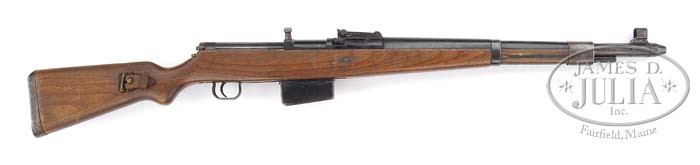 *RARE GERMAN G41 SEMI-AUTO RIFLE. SN 1242a. Cal. 8mm Mauser. Usual configuration with 22″ shrouded bbl, barleycorn front sight on a ramp with a hood and 1,200 meter rear sight. Left side of sight base has an authentic, armorer installed base for the ZF41 scope. Receiver is without markings except for the serial number and a Nazi eagle on right side of the scope base. It also has a “214” Waffenampt on the top rear of receiver, on the safety, on the slide, magazine well, floorplate and on the bbl nut. There probably are other markings on the metal that were not observed. Bottom of stock has the serial number “1878a” and has a larger eagle and indecipherable Waffenampt below trigger guard. Mounted in laminated 1-pc wood stock with a black composition handguard and has an orig sling on left side. Cleaning rod is missing. Few of these early G41’s were ever set up as snipers so with the addition of a ZF41 scope would make this rifle immensely more valuable. CONDITION: Very good to fine, all visible numbers are matching except stock. Bbl & bbl bands retain a blue/brown patina as does the receiver. Bolt slide, magazine & floorplate retain a dark blue finish showing light edge wear. Stock is sound with nicks, dings & scratches and retains a fine hand worn patina. Sling is a little dry with some finish loss. Mechanics are crisp, bright shiny bore. 4-38018 JR332 (5,000-6,000)
