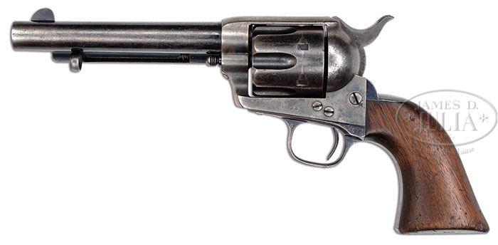 COLT ARTILLERY SINGLE ACTION ARMY REVOLVER WITH POSSIBLE 7TH CAVALRY AND POST OFFICE ASSOCIATION. SN 119923. Cal. 45 Colt. Blue and color case hardened with 5-1/2″ bbl with full front sight and 1-line block letter address. Left side of frame has 3-line patent dates and “U.S.”. Mounted with 1-pc walnut grip whose backstrap channel is obscured by oil stain. Grip has a “RAC” (Rinaldo A. Carr) sub-inspector cartouche below the date “1903” on right side. Both bottom edges of grip have the “RAC” initials and the right edge has what appears a Social Security Number “450-66-8441”. Bbl is a restored replacement with factory re-rolled address and “RAC” initials on bottom. Bottom of frame and cyl have “DFC” (David F. Clark) sub-inspector initials. Bbl is unnumbered with the cyl having 4 digits of SN “2456”. Trigger guard and backstrap are numbered “4881”. The SN “4881” is listed on pp 270-271 of Colt Cavalry and Artillery Revolvers..A Continuing Study, Kopec & Fenn as having been returned to Colt “unserviceable” in 1895 and as an existing artillery revolver. This trigger guard and backstrap originated on a cavalry revolver which was issued in March 1874 in a shipment of 1,000 revolvers in the serial range 4500 through 5504, lot five. 755 of these revolvers were issued to Custer’s 7th Cavalry Regiment and 433 to the 1st Cavalry. The total strength of Custer’s command at Little Big Horn was 632 troopers, all armed with Colt Single Action Revolvers. Of those a total of 492 were armed with revolvers from the lot 5 serial range noted above. Custer’s command had 266 troops killed in action and 59 wounded. While there are no records to positively identify SN 4881 as having been a Custer issued revolver, there is a very strong probability that it was issued to a trooper in Custer’s command and therefore at the Little Big Horn. Pg 80 of the referenced publication lists SN 119923, the frame number of this revolver, as having been issued to the Post Office in 1890 and later modified into an artillery model in 1903. PROVENANCE: Wes Adams Estate Collection. CONDITION: About fine. Bbl retains about 75-80% strong blue with holster wear around muzzle and left side; frame retains 30-40% faded case colors with the balance turned silver, markings are faint; hammer retains 65-70% case colors; trigger guard and backstrap retain blue in sheltered areas with the balance blue gray patina; cyl retains thin blue on outer diameter, stronger in flutes; ejector housing retains about 60% strong blue in flutes; grip is sound, showing heavy wear with a few light nicks and scratches and retains a hand worn patina; mechanics are fine; strong bright bore with scattered pitting. 4-44717 JR259 (8,000-15,000)