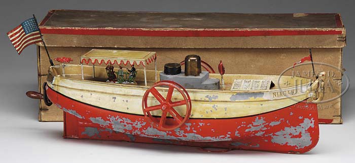 UEBELACKER PADDLE WHEEL BOAT WITH ORIGINAL BOX. Very handsome side wheeler hand enameled with brown deck and upper sides, brown canopy with red pinstripes, red hull and side paddles. Retains both decals stating “Niagara”. Under the canopy are flat lead passengers seated at a table. Boat is highlighted by gold figurehead in the form of a mermaid and two flags. Red ship’s wheel at stern turns rudder. Uebelacker used a unique windup mechanism which winds with a hand crank at the rear of the boat. Accompanied by its original box and instruction sheet. SIZE: 12-1/2″ l. CONDITION: Boat is in very good condition with significant paint flaking to hull. Box is very good with one puncture hole to one side. 1-10854 (1,000-2,000)
