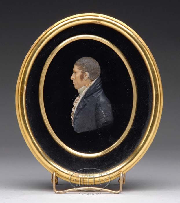 AMERICAN COLORED WAX SILHOUETTE PORTRAIT. Attributed to the work of John Christian Rauschner working in Salem, MA Circa 1809-1810. Half portrait silhouettes worked in colored waxes in the manner of J. C. Rauschner, mounted in a later oval gilt Victorian frame impressed “Foster Bros. Boston”. SIZE: Bust is 3” x 1-3/4”. Overall is 7-1/4” x 6-1/4”. CONDITION: Very good original condition. 9-73892 SM (1,500-3,000)