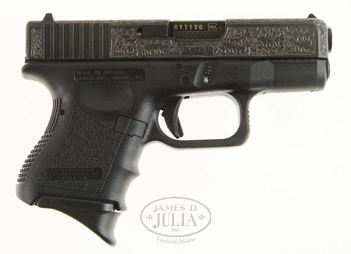 BEAUTIFUL ENGRAVED GLOCK MODEL 26 SEMI AUTO PISTOL. Cal. 9mm. SN BYT170US. Compact Glock with 3-1/2″ bbl, composite frame with steel slide and two 10 rnd magazines. The slide is beautifully deep relief engraved with oak leaf & acorn patterns on the top & both sides. Accompanied by its orig Tupperware style black case owners manual & instruction pamphlets. CONDITION: Extremely fine, may have been fired but if so, very little. Retains virtually all of its fine post engraving finish on the slide and all its factory finish on the frame. Box is fine. 4-57856 JR331 (700-1,200)