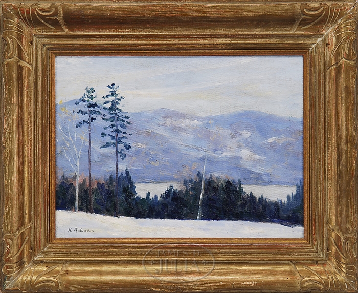 HAL ROBINSON (AMERICAN, 1875 – 1933) WINTER LANDSCAPE. Oil on board scene shows a snow-covered ground looking over woods and lake to blue mountains. Signed lower left “H. ROBINSON”. Housed in a carved gilt frame. SIZE: Sight size: 11″ x 15″. CONDITION: Very good. 9-97700 (1,000-1,500)