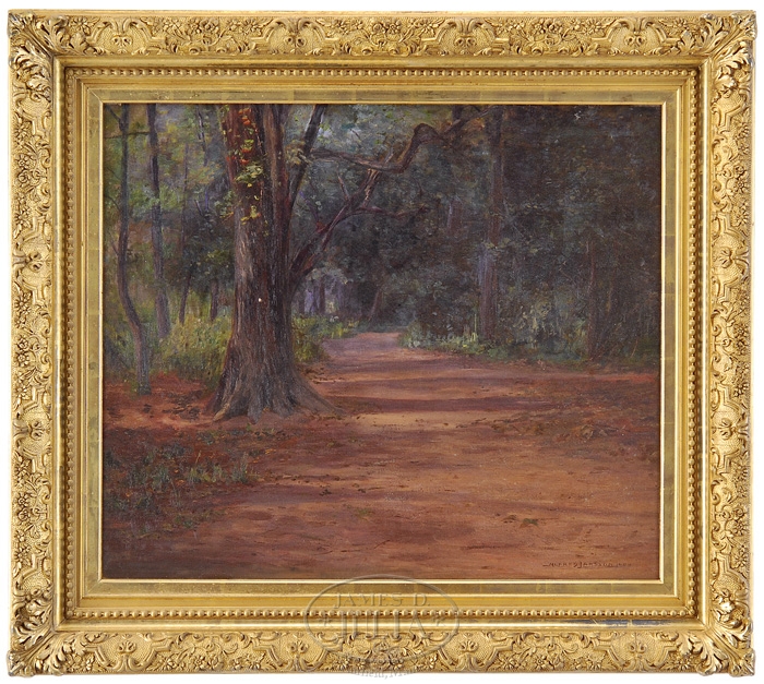 ALFRED JANSSON (American, 1863-1931) ROAD THROUGH THE WOODS. Oil on canvas scene shows a wide dirt road through deep forest. A large tree is seen in foreground. Signed lower right and dated “1904”. Housed in an outstanding period gesso decorated gilt frame with gilt liner. SIZE: 24” x 28”. CONDITION: Relined, inpainting, small nick in tree. Otherwise very good. 9-96932 (1,000-1,500)