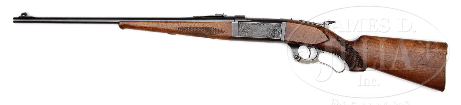 Please Note: This is an 1899-G Model. *CASED SAVAGE MODEL 99 LIGHTWEIGHT TWO BARREL SET. SN 336084. Cal. 30-30 and 410. Receiver is very nicely engraved in the period of use, not believed to be factory work, with wolf on one side and hunter shooting stag on other encased in foliate scrollwork and punch dot matrix. Orig wood is checkered A grade with shotgun style buttplate. Orig sights including folding tang sight. Case appears to have been relined and looks very good with correct Savage label on the inside with orig box of Savage cartridges. PROVENANCE: Wes Adams Estate Collection. CONDITION: Very good condition. Rifle bbl retains 75% thinning blue, receiver probably 40% thinning blue. Shotgun bbl retains 95% orig blue. Orig wood shows some minor wear but generally sound and serviceable with light mars and dings.Very good bore. 4-44861 LM65 (2,500-3,500)