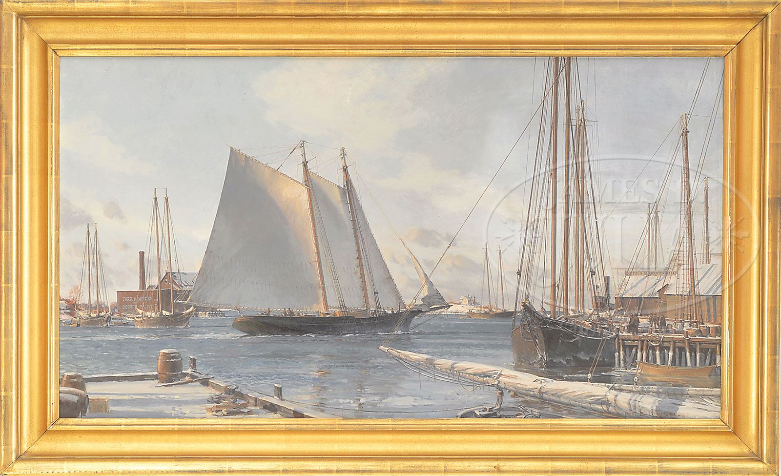 CHRISTOPHER BLOSSOM (American, 1956- ) “HELEN G. WELLS LEAVING GLOUCESTER IN WINTER”. Oil on canvas Housed in a modern gilt molded wood frame having a Grand Central Art Galleries Exhibition label on verso Signed bottom right “Christopher Blossom” SIZE: 22″ x 40″. Overall: 27-3/4″ x 45-3/4″. CONDITION: Very good. 9-29136 (5,000-10,000)
