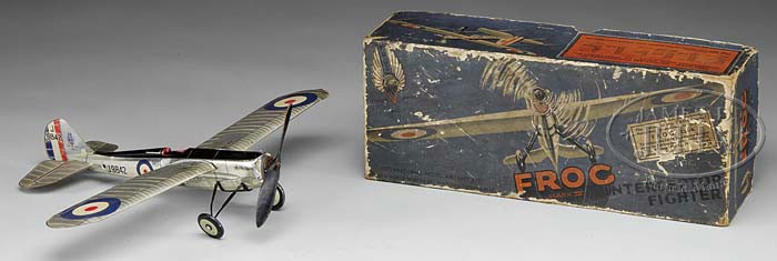 FROG AIRPLANE WITH ORIGINAL BOX. Very unusual toy manufactured by International Model Aircraft Ltd. Toy has a tin body with paper wings and wood propeller. Toy comes disassembled and when put together is propelled by a rubber band motor. Airplane comes with original box complete with instructions. SIZE: Plane is 8-1/2″ l. CONDITION: Plane is in very good plus condition. Box shows some wear, especially to edges. 1-10862 (250-450) Auction: Advertising, Toy & Doll - Spring 2011 Please Note: All prices include the hammer price plus the buyer’s premium, which is paid by the buyer as part of the purchase price. The prices noted here after the auction are considered unofficial and do not become official until after the 46th day. |