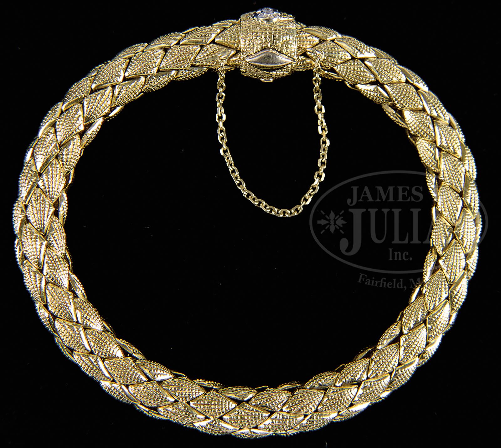 18KT GOLD CHIMENTO BRACELET. 18kt yellow gold chimento bracelet has round woven 18kt band with center clasp having a tiny full cut diamond set in a white gold bezel. The bracelet is signed on the underside “Chimento” and is complete with a safety chain. Weight is 36 grams. SIZE: 7″ l. CONDITION: Very good to excellent. 5-68159 (1,500-2,500)