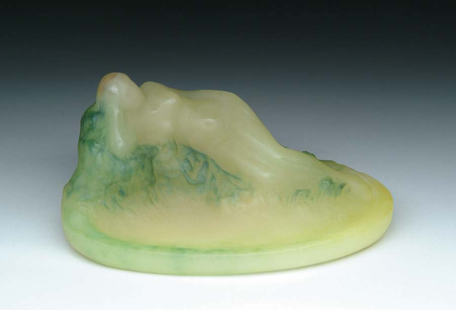 A. WALTER NUDE. Lovely pate de verre tray has nude reclining on grassy knoll. Signed on bottom of tray “A. Walter Nancy” with artist initials “J.D.”. SIZE: 6-3/4 in. l x 3 in. t. CONDITION: Very good to excellent. 5-61117 (4,000-6,000)