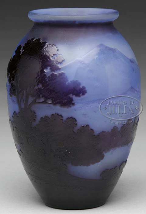 GALLE FRENCH CAMEO VASE. Exceptional quality blue mountain bulbous vase has nicely cut purple trees and foliage in the foreground. Signed “Galle” in script to side of vase. SIZE: 4-1/2″ t. CONDITION: Very good to excellent. 5-62674 (2,750-3,250)